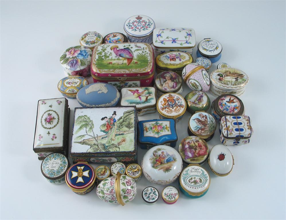 Nineteen decorative ceramic boxes, fifteen enamel boxes and two small tape measures, many with hinged or removable covers, 10cm. Max. (36)