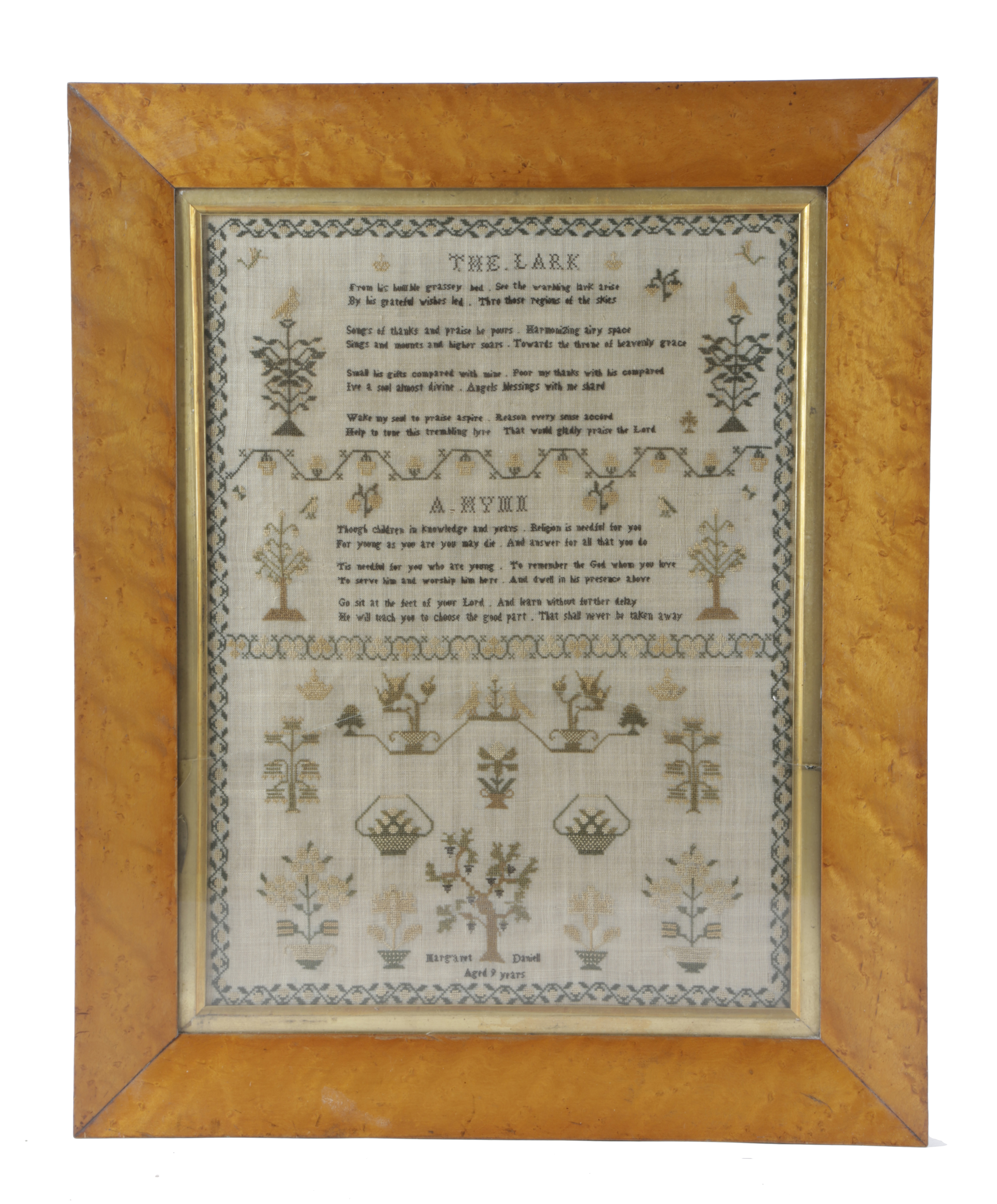 worked with birds, tress, baskets of fruits and urns of flowers, inscribed with 'The Lark A Hymn' and signed 'Margaret Daniell Aged 9 years', in a glazed (cracked) bird's eye maple frame
