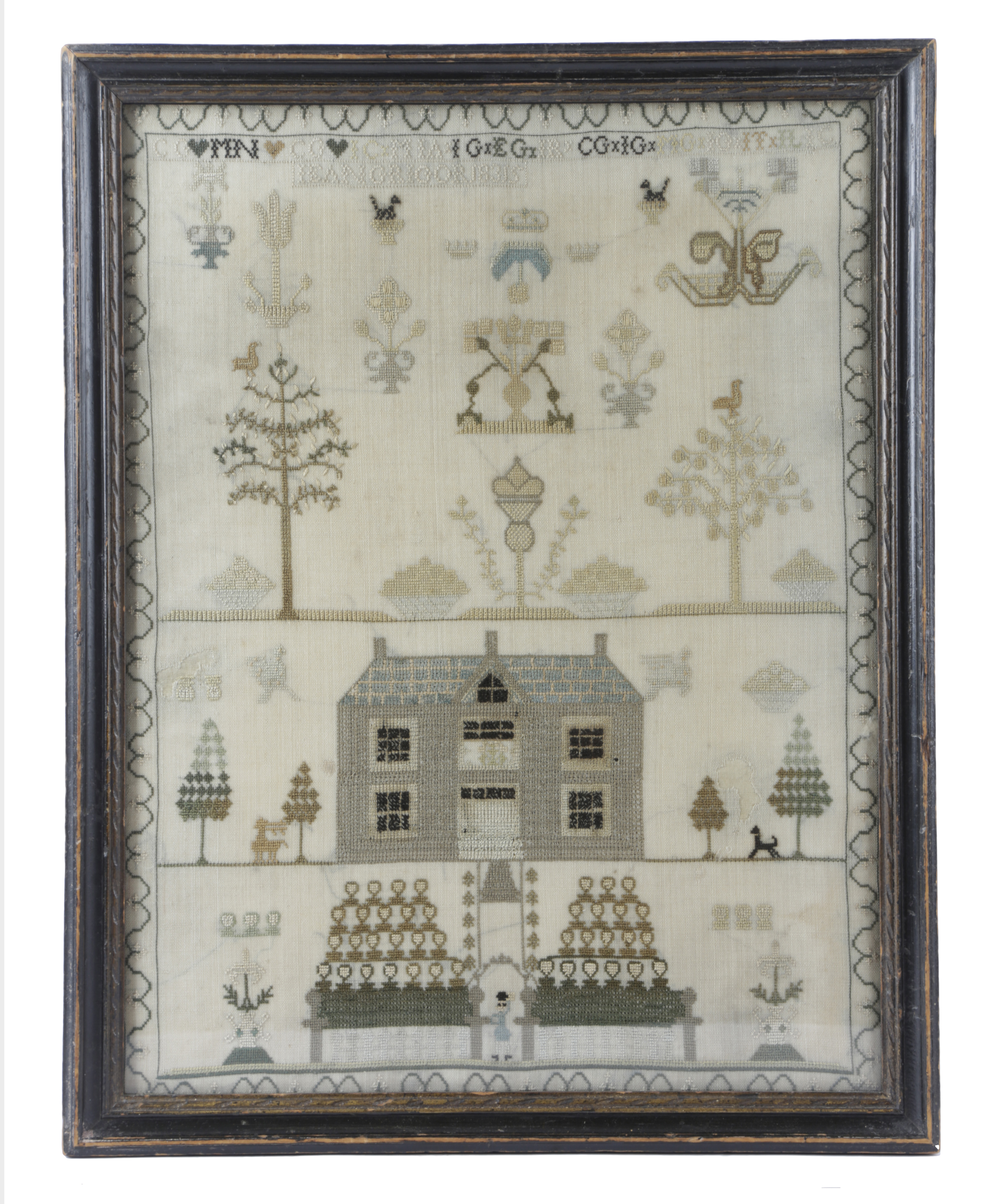 worked with a house with a figure between elaborate gates, birds in trees, urns of flowers, with three crowns, with family initials, lovehearts and with a signed panel dated '1835', in a glazed ebonised frame