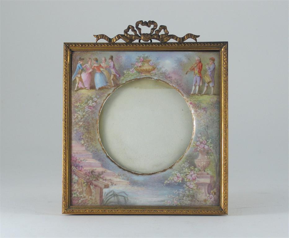 A single gilt-metal mounted porcelain picture frame, painted with musicians and figures dancing in a garden, c.1900, 29.5cm.