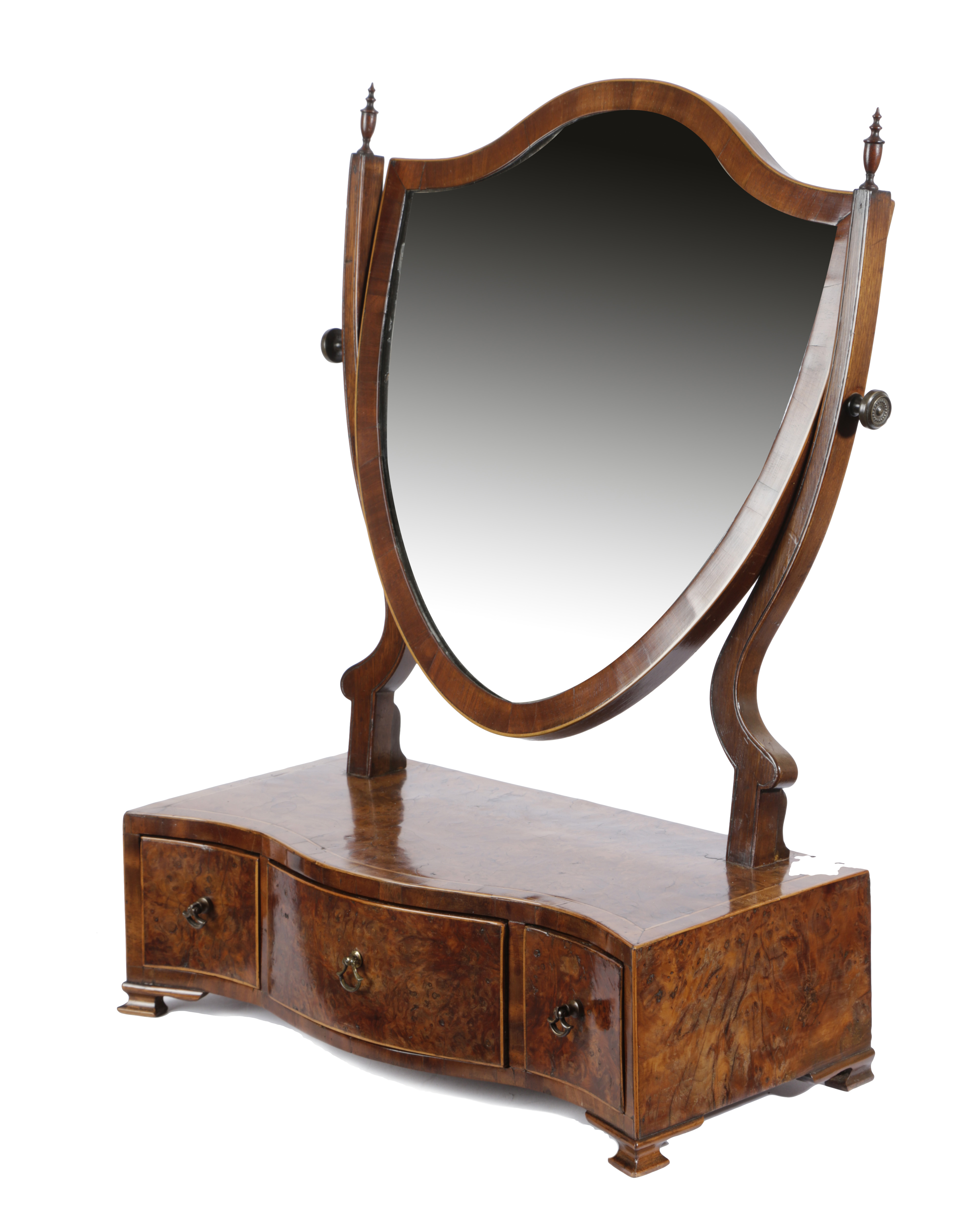 A GEORGE III BURR YEW SHIELD SHAPE DRESSING TABLE MIRROR