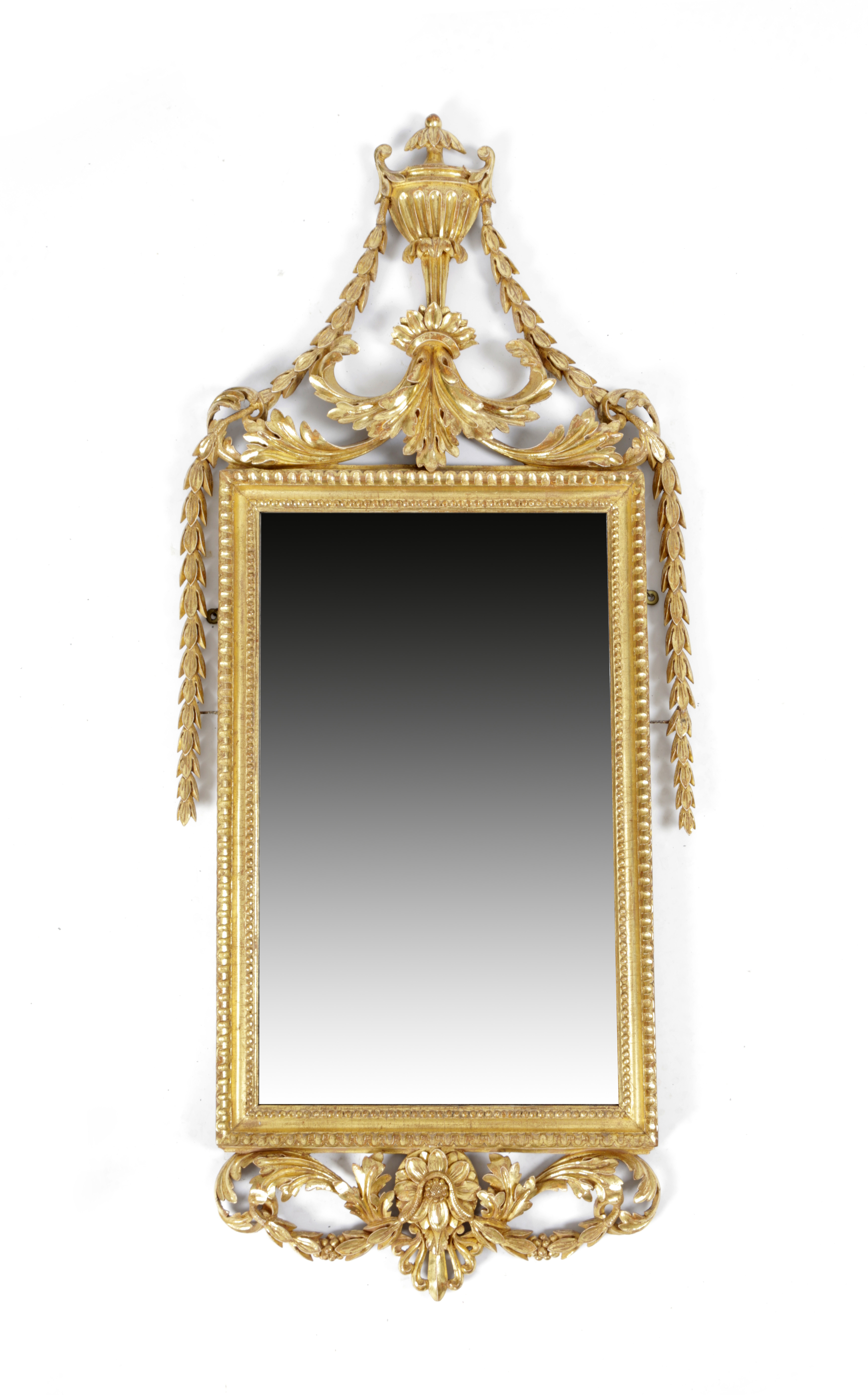 the rectangular plate within a beaded slip and a fluted outer frame, the urn and leaf surmount with husk drapes, the base carved with leaves, a flowerhead, berries and a palmette, re-gilt