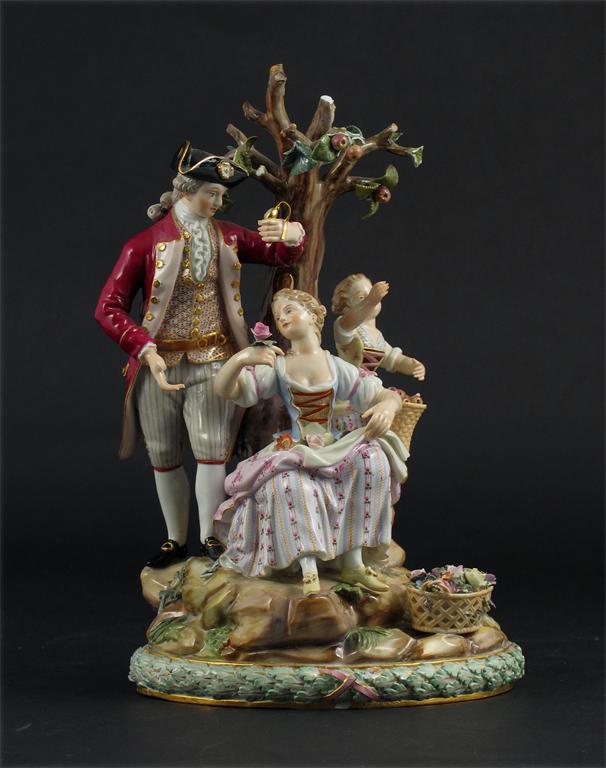 A Meissen group of a young man and woman, beneath an apple tree, she sits collecting flowers in her apron, with a basket to her side and with a small child collecting fruit at her elbow, crossed swords and incised marks. Typical chips to the branches and leaves. 19th century, 24cm.