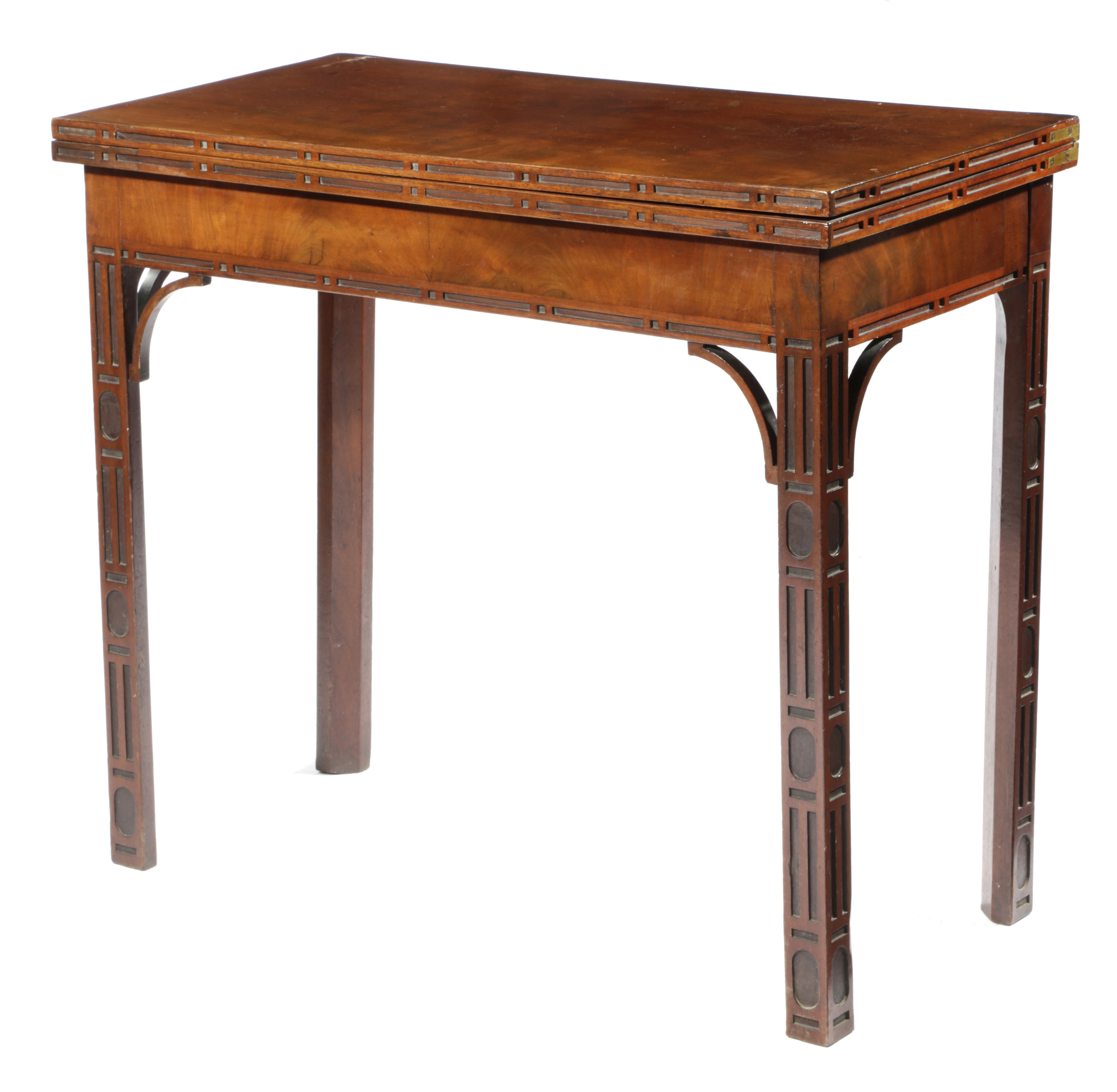 with blind fret carved decoration, the fold-over top with a baize lined playing surface, on twin gate supports and chamfered legs