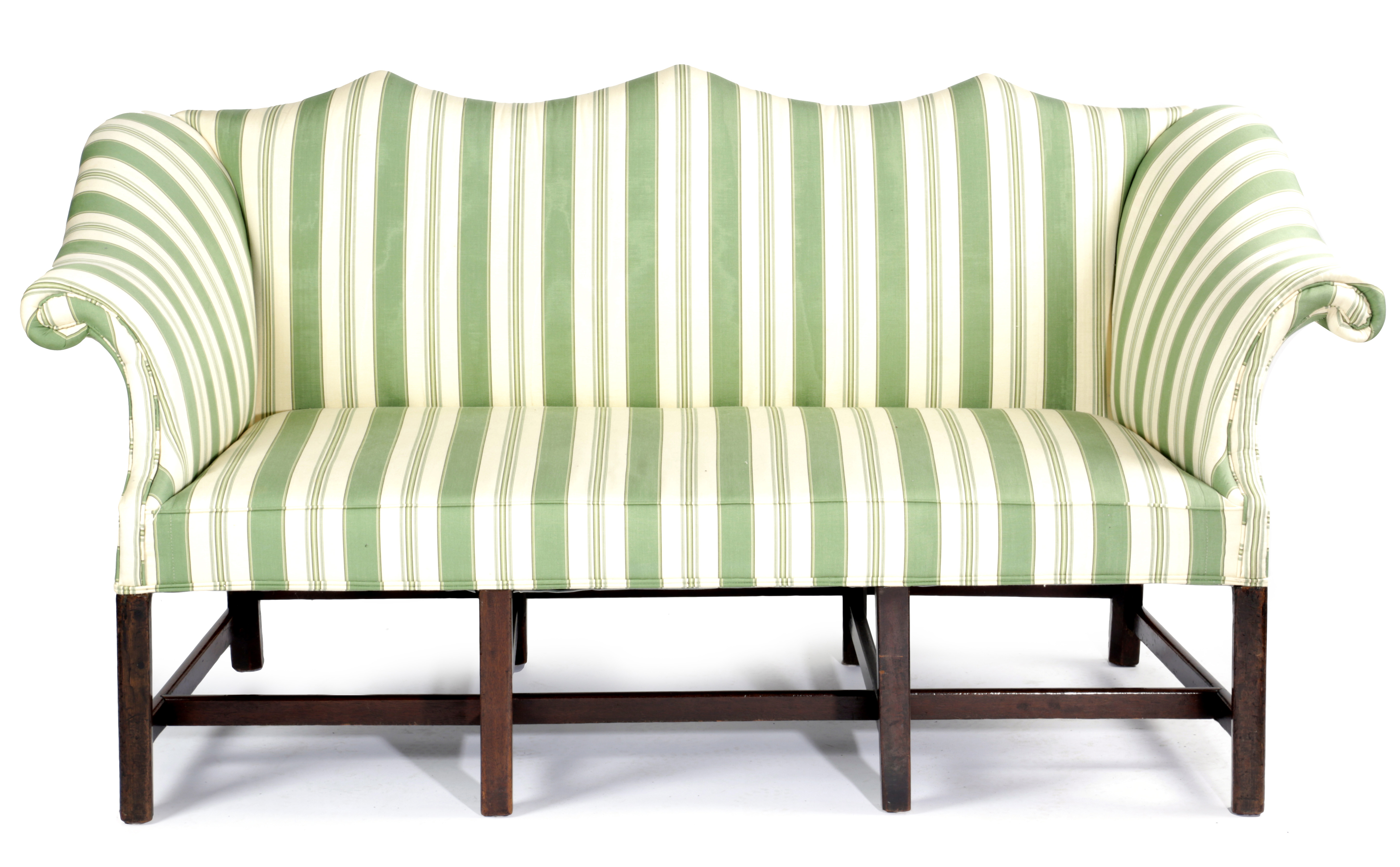 upholstered in striped fabric, with a serpentine back, above scroll arms, on chamfered supports united by stretchers