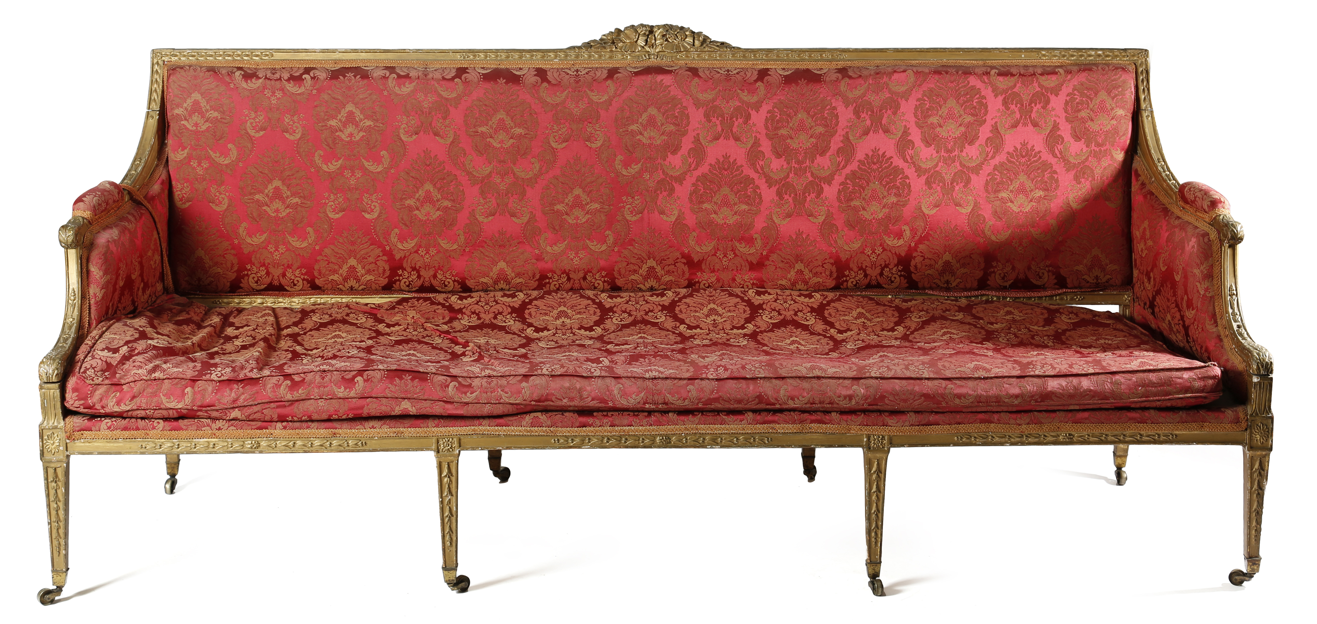 the moulded frame carved with husks, leaves and flowers, upholstered with damask fabric, with a cushion, on square tapering legs and brass caps and castors