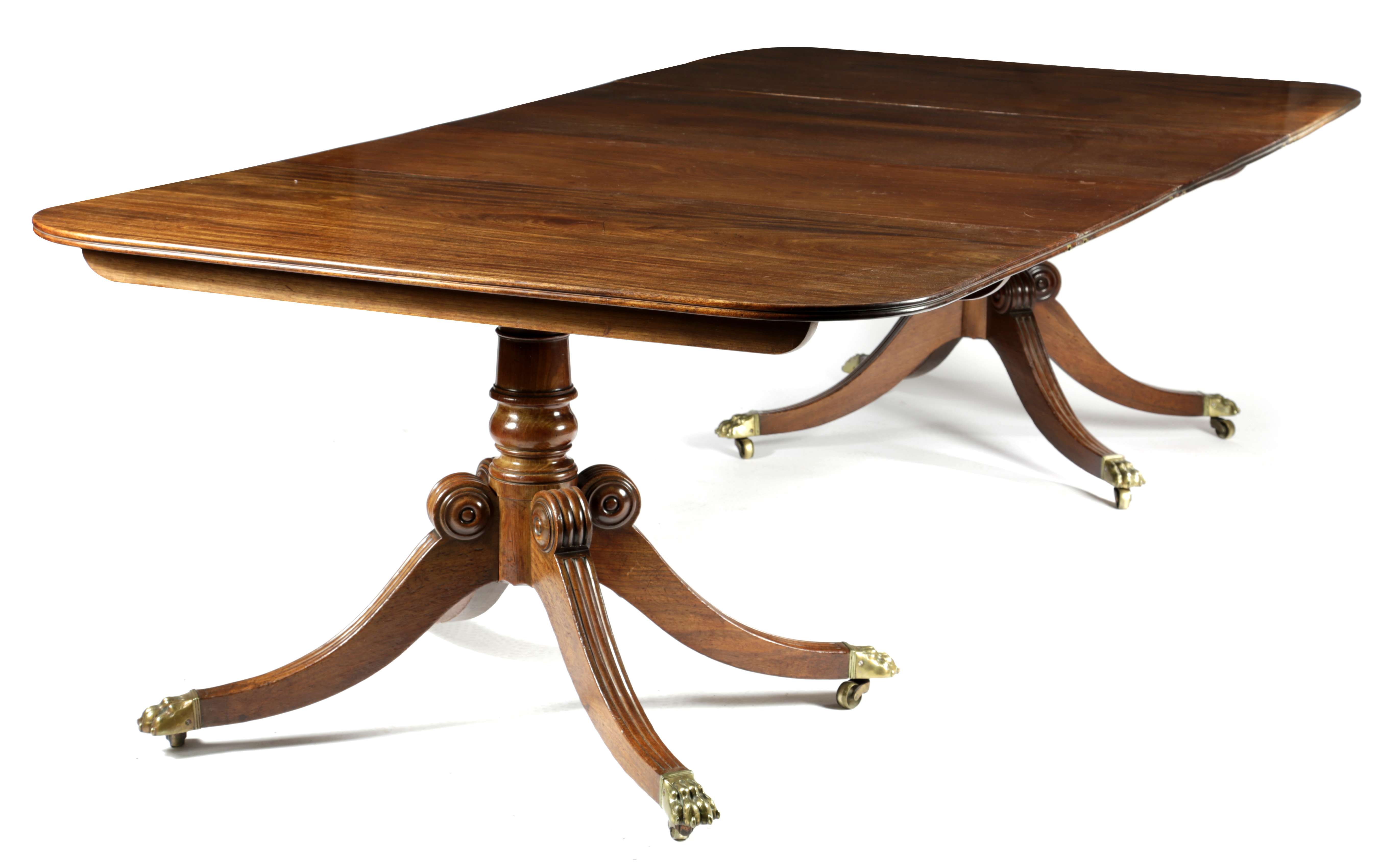 A REGENCY MAHOGANY TWIN PEDESTAL DINING TABLE