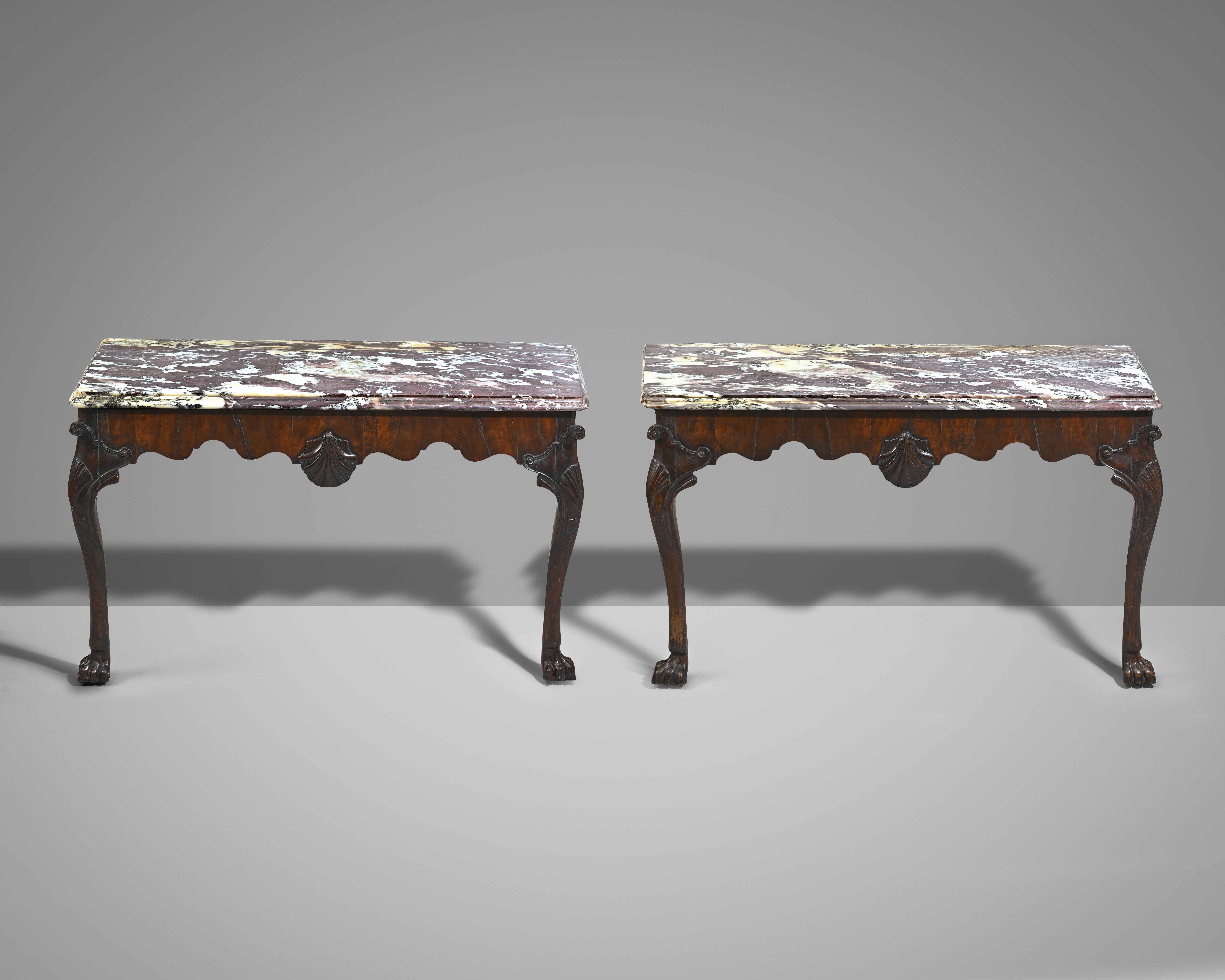 each with a moulded breche violet marble top, above a shaped frieze centred with a carved scallop shell, on scroll, shell, leaf and husk capped legs and lion's paw feet (2)