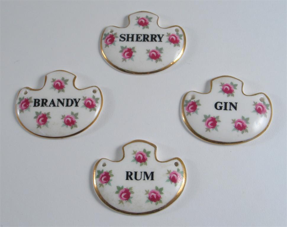 Four bottle tickets, inscribed 'Brandy', 'Sherry', 'Rum' and 'Gin', 20th century, 5cm. (4)