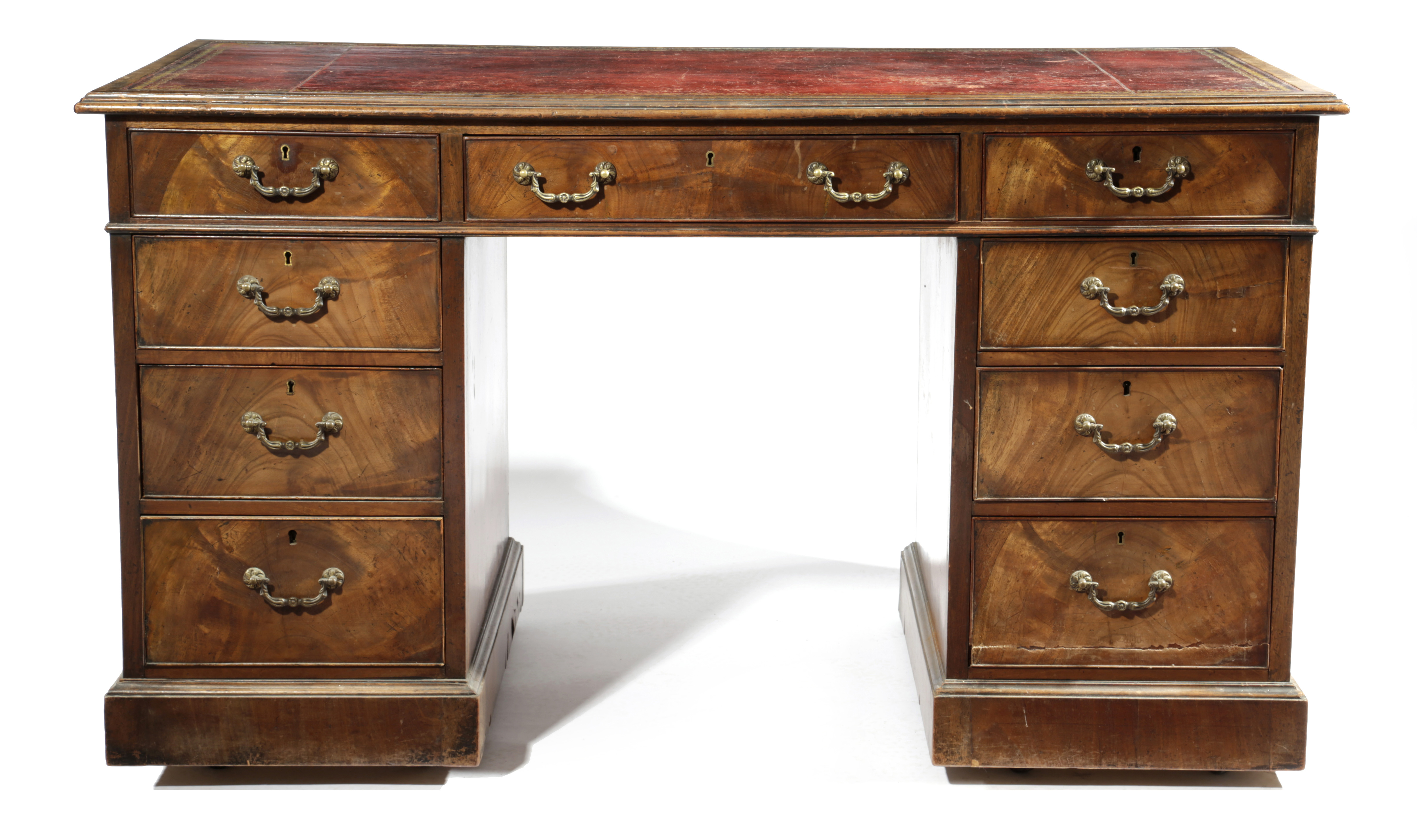 the moulded edge top inset with a later red and gilt tooled leather surface, above an arrangement of nine drawers, on castors, all in one