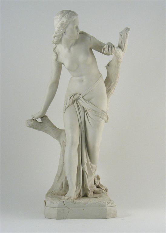 A large Royal Worcester Parian model of a wood nymph, leaning forward before a tree, inscribed to the reverse 'T. Brock.Sc, London 1868'. Damaged. 64cm.