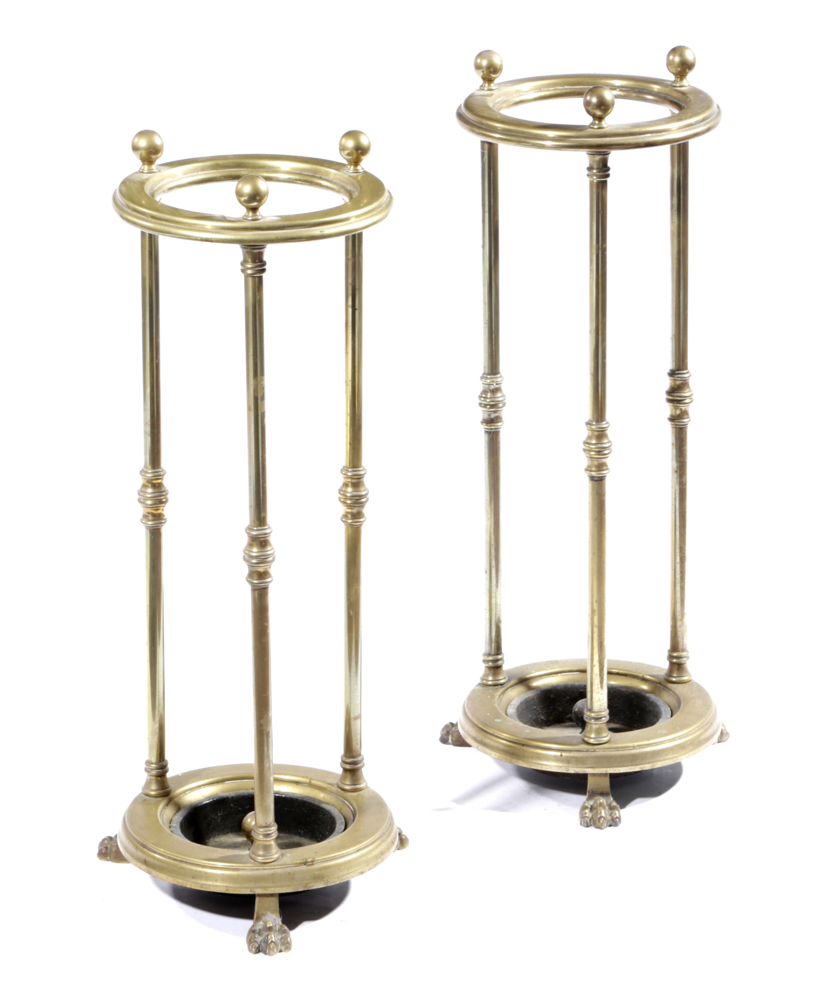 A PAIR OF VICTORIAN BRASS CIRCULAR STICKSTANDS