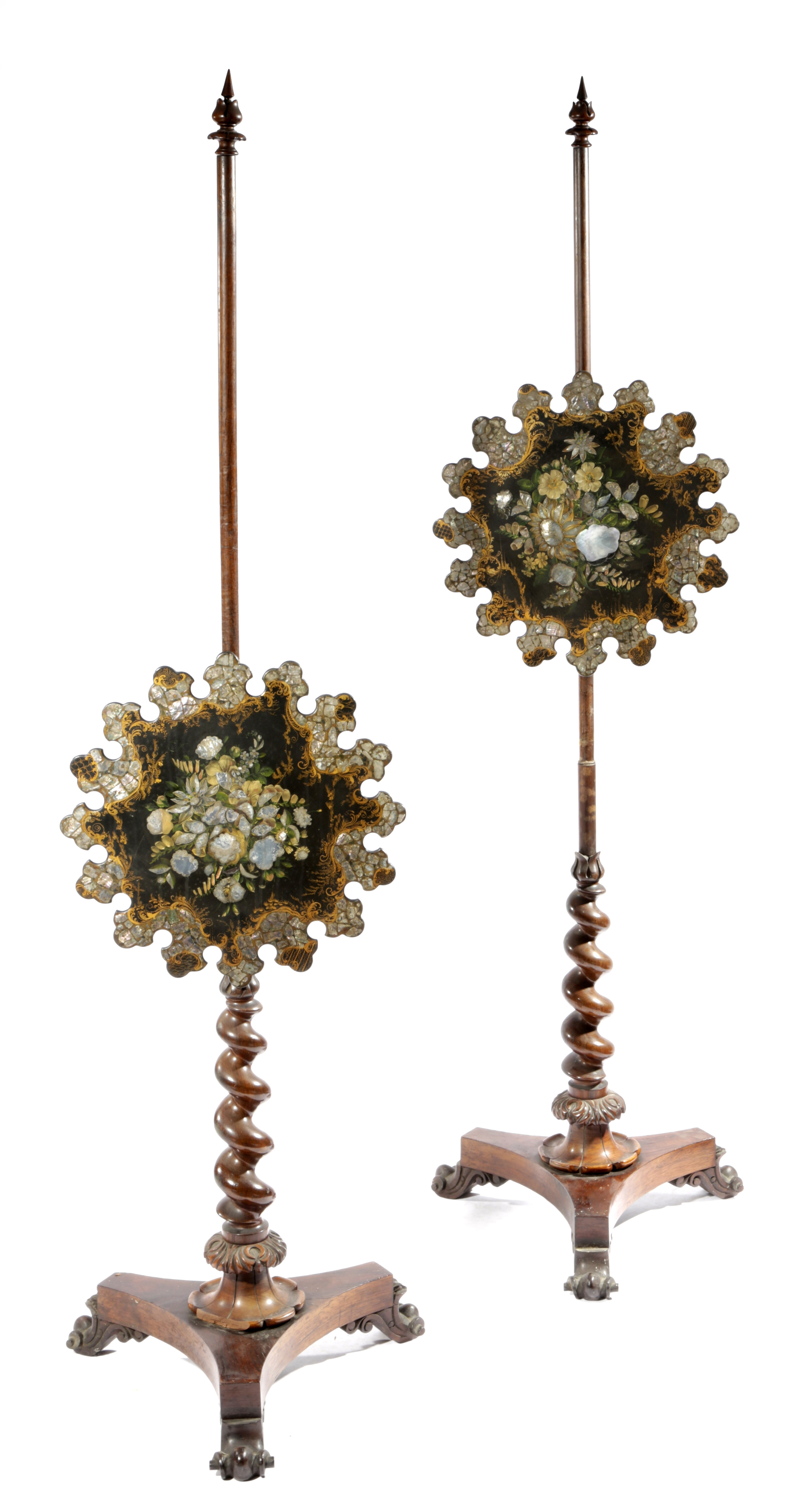 Λ A PAIR OF VICTORIAN ROSEWOOD AND PAPIER-MACHE POLE FIRE SCREENS