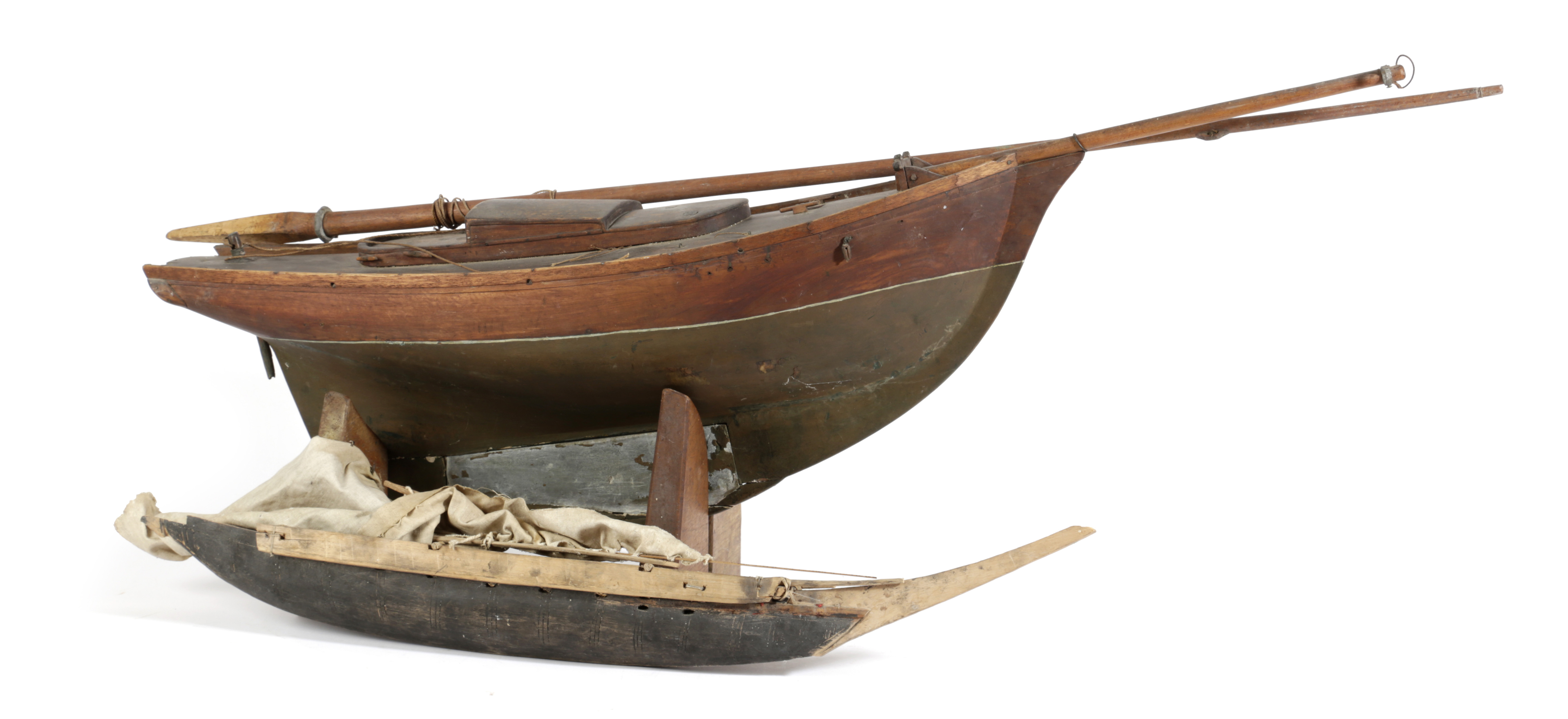 with a lead keel and cotton sails, on teak supports, together with a South Sea Islands model boat (2)