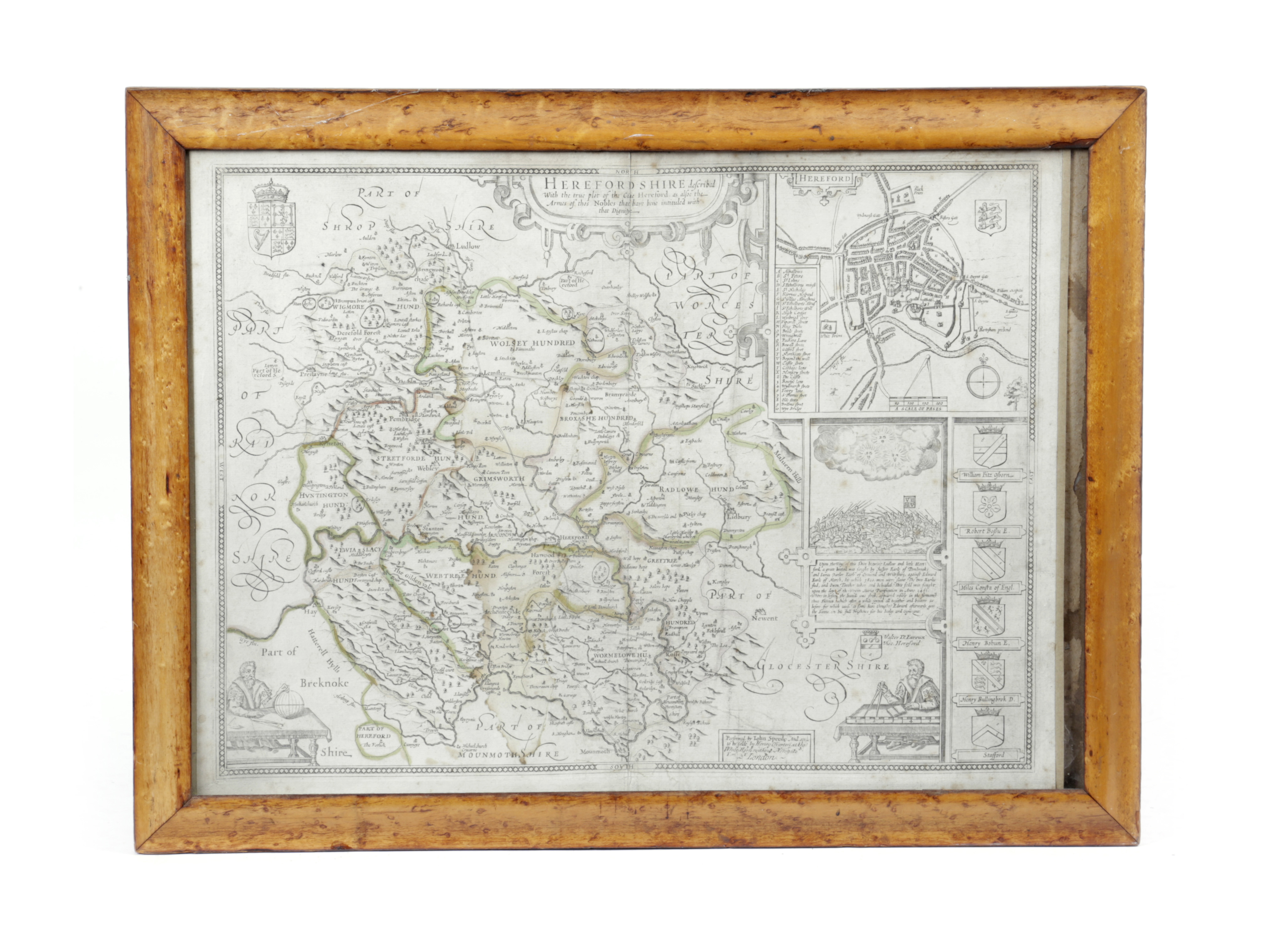 a black and white engraved map, with an inset map of Hereford, inscribed 'Performed by John Speed and to be solde by Henry Overton at the White Horse without Newgate London, in a later glazed bird's eye maple frame, together with a hand-coloured engraved map of Cornwall by Blaueu, titled 'Cornubia', with Latin text to verso, in a later glazed oak frame (2)