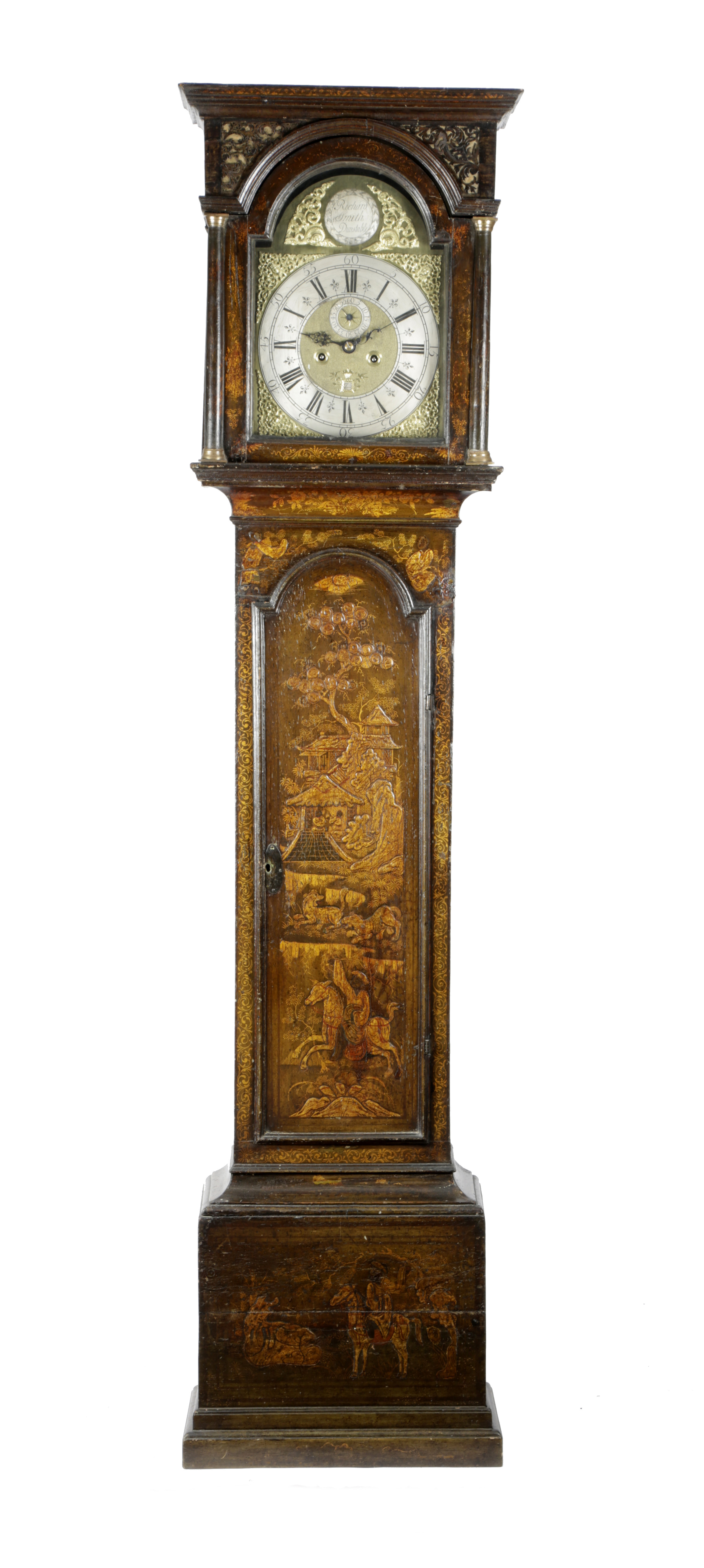 the brass eight day movement with four turned pillars and an anchor escapement, striking on a bell, the arched twelve inch dial wit a silvered chapter ring with Roman and Arabic numerals, the matted centre with a date aperture and subsidiary seconds dial, with gilt female mask spandrels, the arch with a signed rondel 'Richard Smith Dunstable', the case gilt decorated with chinoiserie scenes, with pagodas, animals and figures on horseback, the hood with fret spandrels