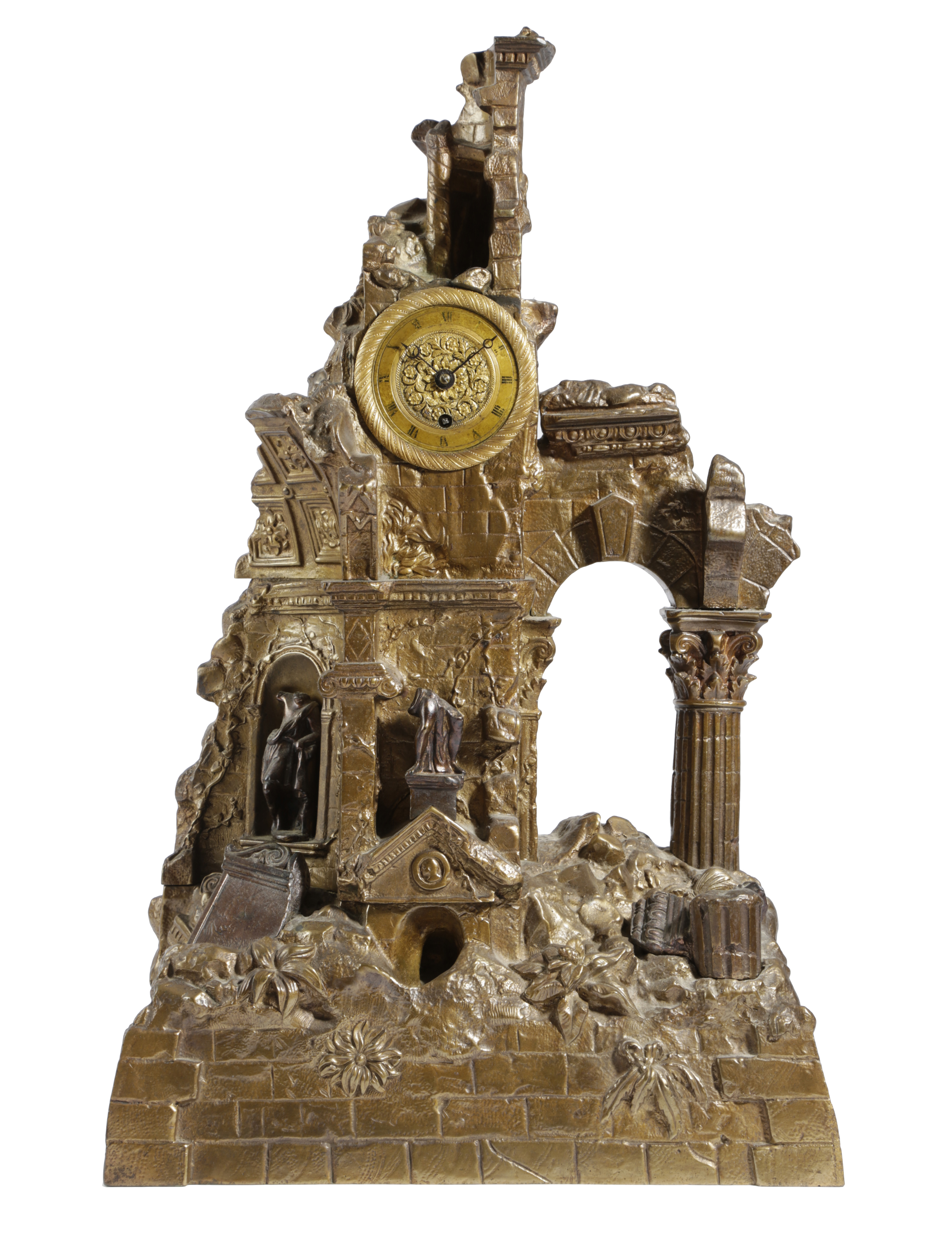 A FRENCH BRONZE NOVELTY GRAND TOUR CLASSICAL RUINS MANTEL CLOCK