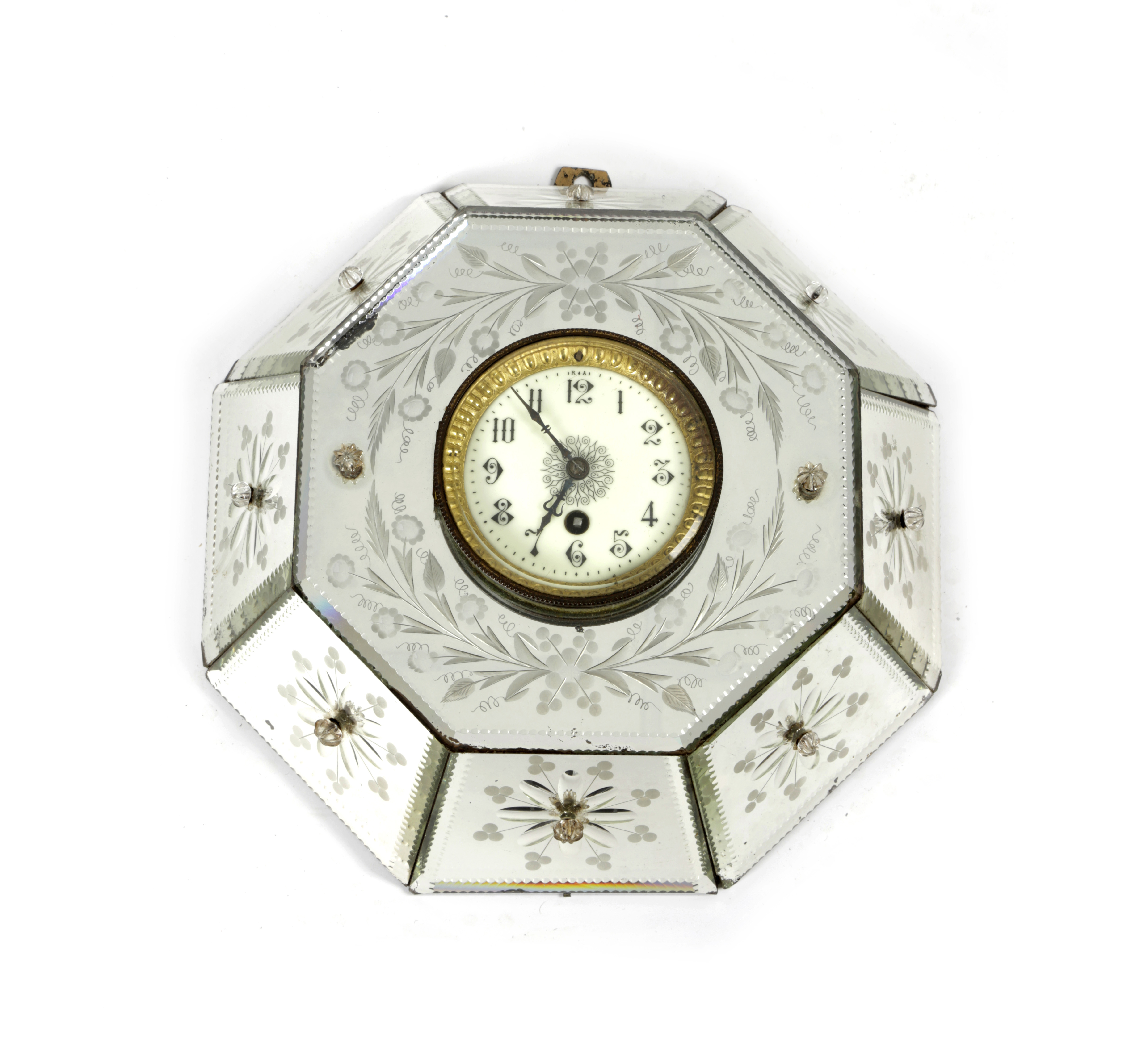 the French brass eight day drum movement with a circular dial with Roman numerals, the Italian Venetian case comprised of mirrored glass panels with etched folitae decoration and applied with flowerheads