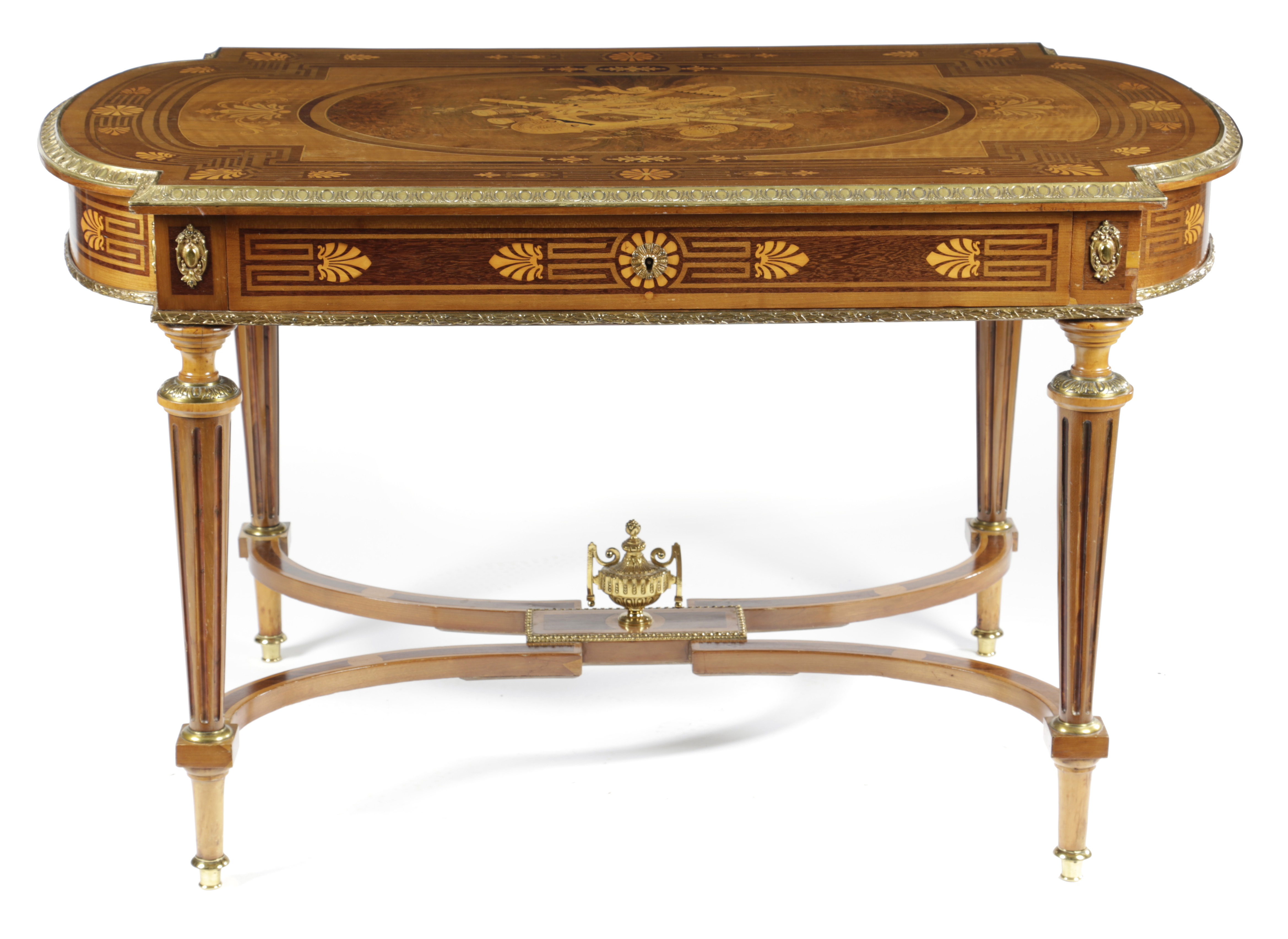 with ormolu mounts, the top with an oval panel marquetry inlaid with musical trophies, with outer bands of anthemion motifs, above a frieze drawer, on fluted tapering legs united by an 'X' stretcher centred with an urn
