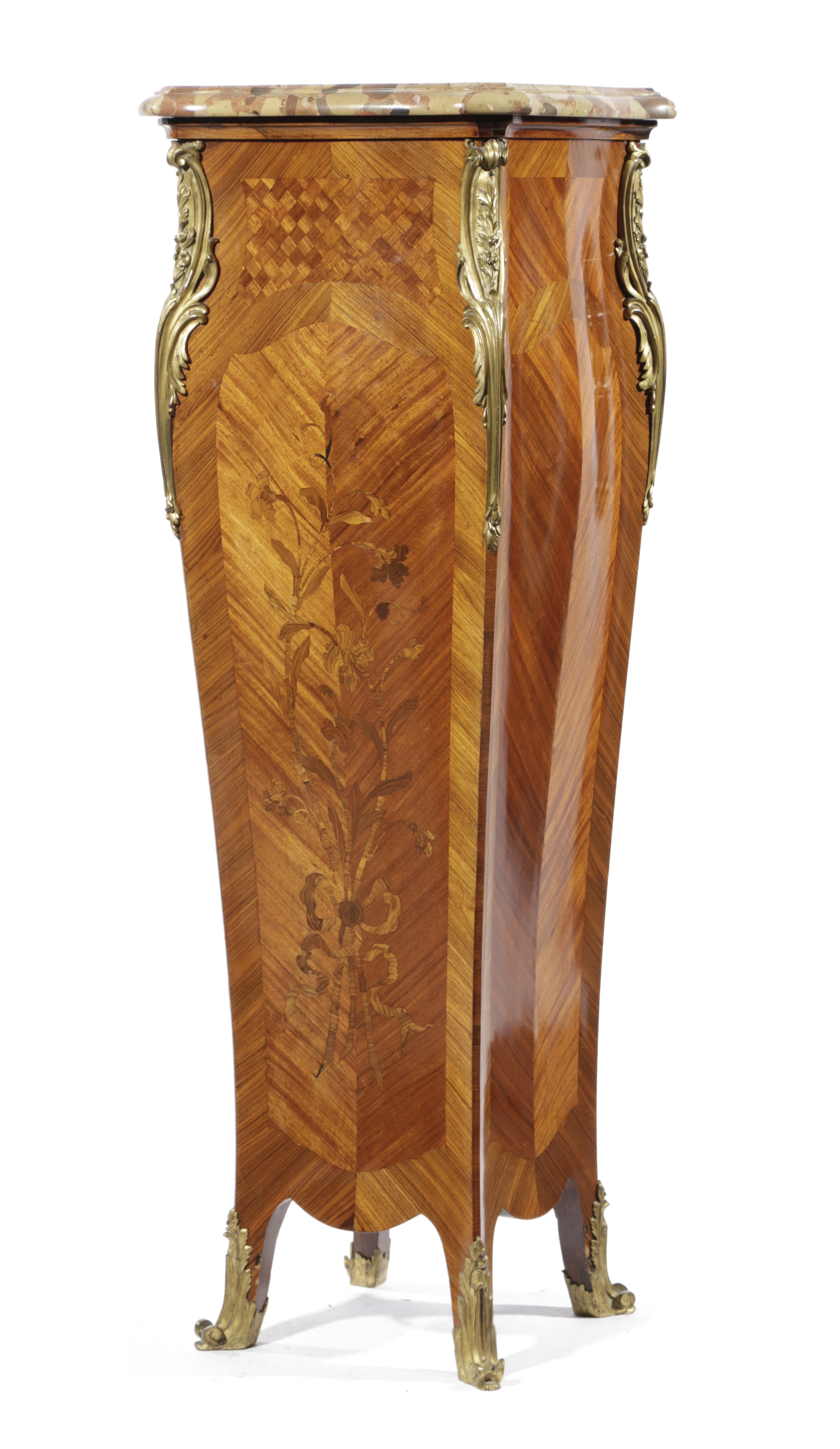 A FRENCH KINGWOOD AND MARQUETRY PEDESTAL IN LOUIS XV STYLE