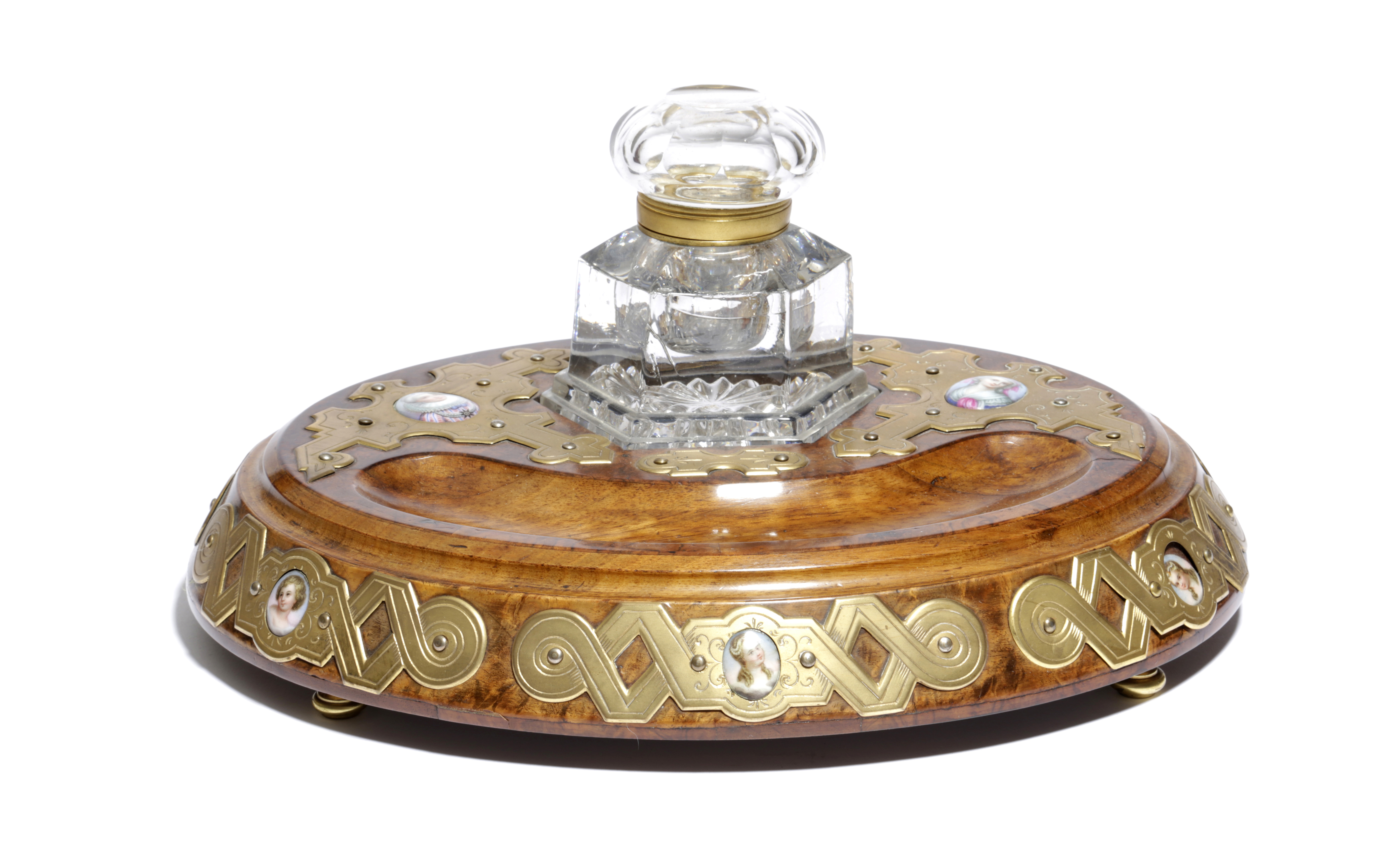 with gilt brass strapwork mounts and oval porcelain plaques painted with portraits, with a cut-glass inkwell