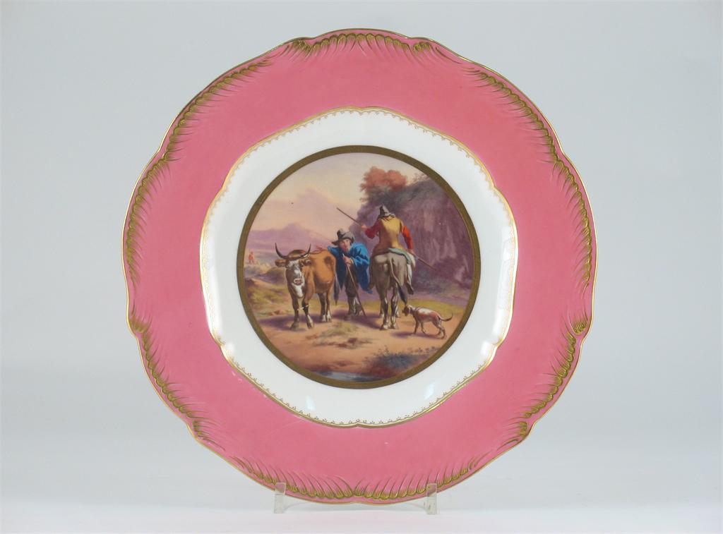 An unusual Coalport plate, painted with herdsmen within a wide pink and gilt border, a gilt ampersand mark, mid 19th century, 24.5cm.