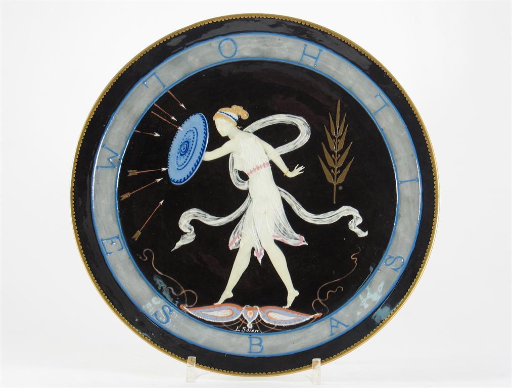 A rare dated Minton pte-sur-pte plate by Marc Louis Solon, decorated in polychrome with a young female warrior in flowing diaphanous robes, defending herself with a shield from seven arrows, she stands upon a bow which incorporates the date 1874 above the signature 'L Solon', all upon a chocolate ground within a band inscribed 'Basil Holmes', a gilt dentil rim, impressed marks, 23.5cm. It is interesting to note that Solon exhibited his multi-coloured pte-sur-pte at all the major international exhibitions and first showed his Pompeiian or Etruscan styles in Vienna in 1873.