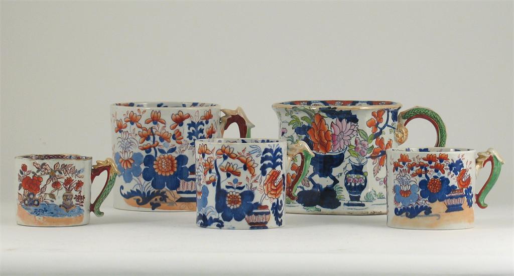 Five Mason's Ironstone mugs, variously decorated with stylized flowers and foliage, all with factory marks, 23cm. Max. (5)