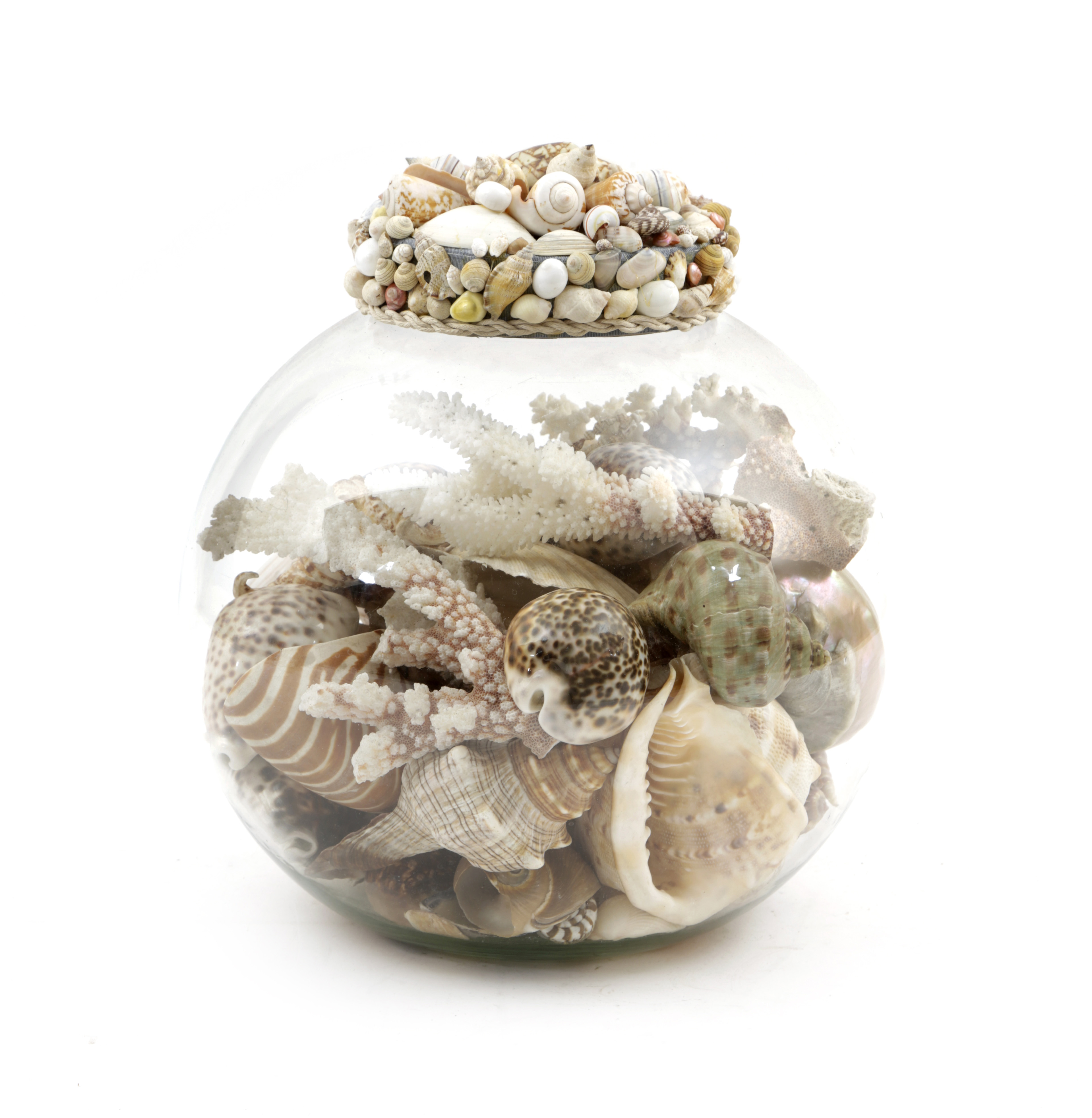 the globular jar containing various shells and corals, the lid encrusted with shells