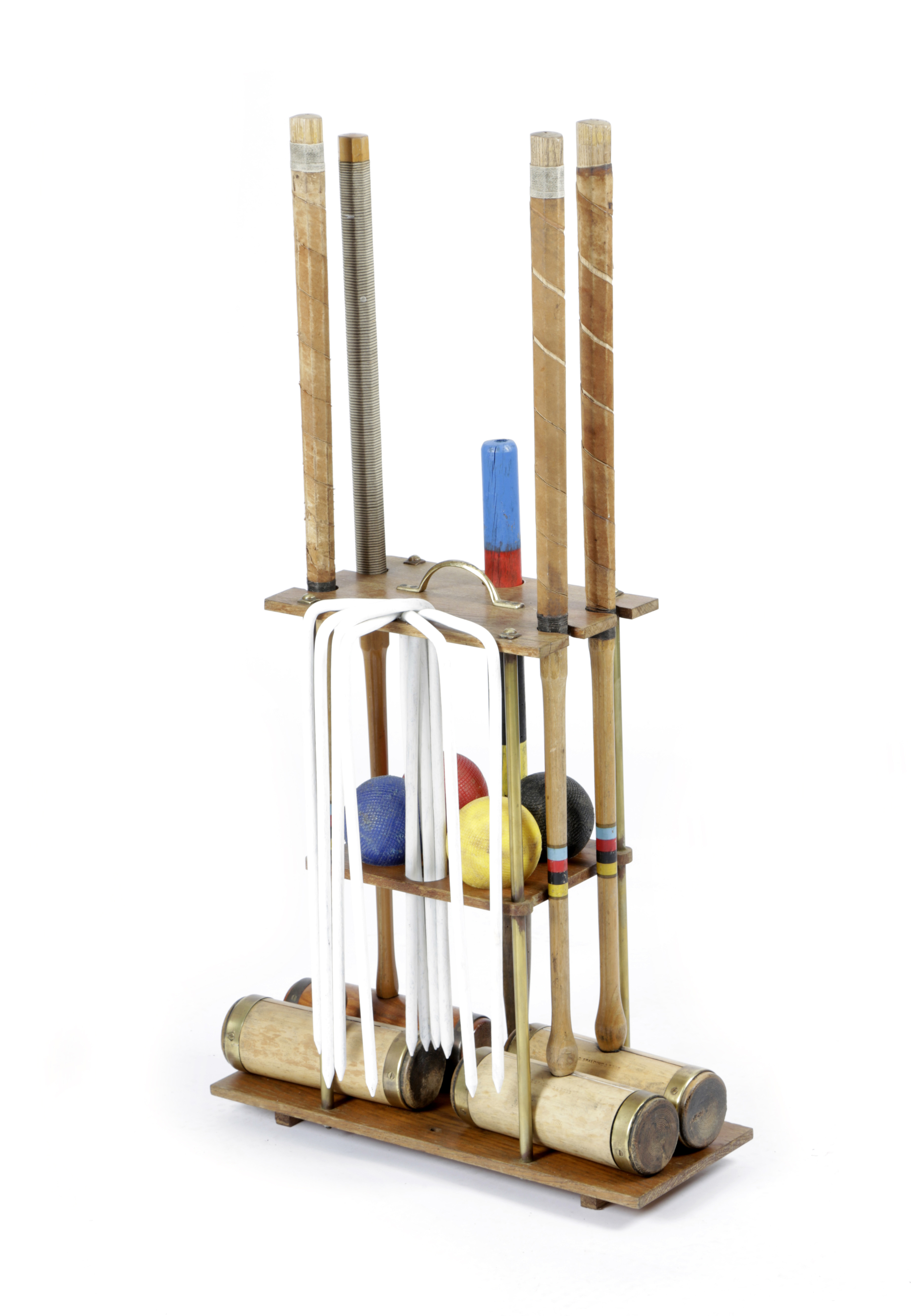 with four mallets, three by Spalding and an associated one by Jaques, with hoops, balls and marker posts, the stand with a brass handle and pole supports