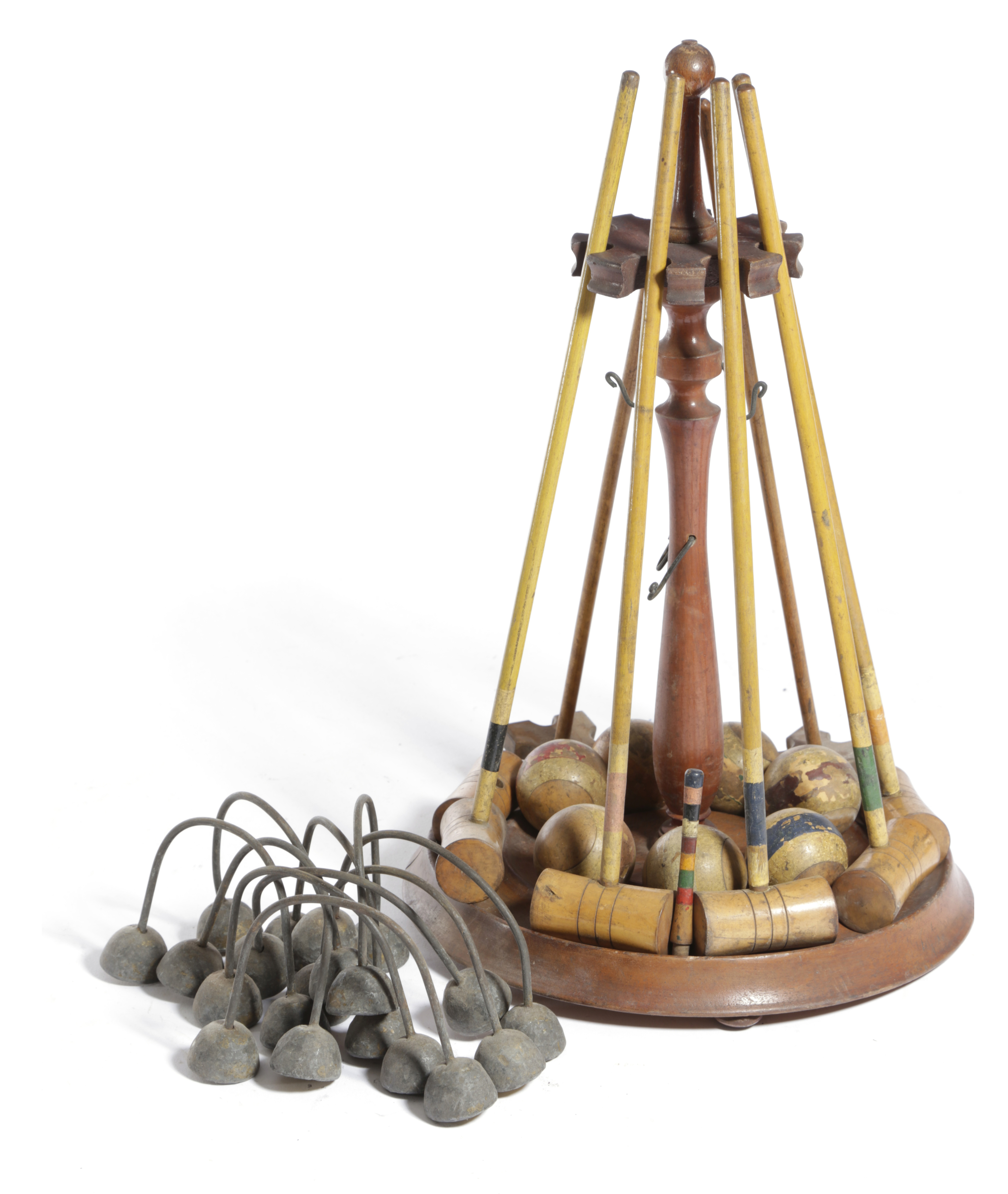with a mahogany stand supporting mallets, balls, a marker post and hoops, in a pine open box