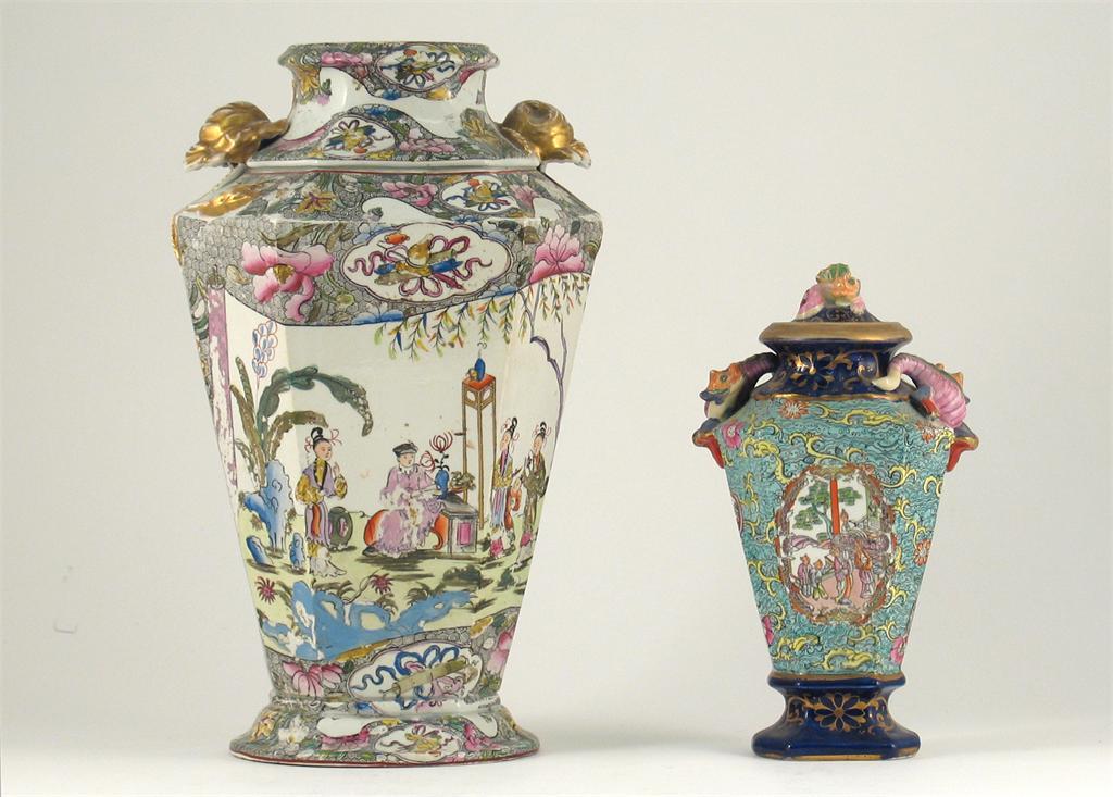 A rare Mason's Ironstone octagonal vase, decorated with Chinese figures, a vase, a swan and auspicious objects and a small octagonal-section vase, cover and inner lid, decorated with panels of chinoiseries, six character seal mark, both 19th century, 37cm. (4)