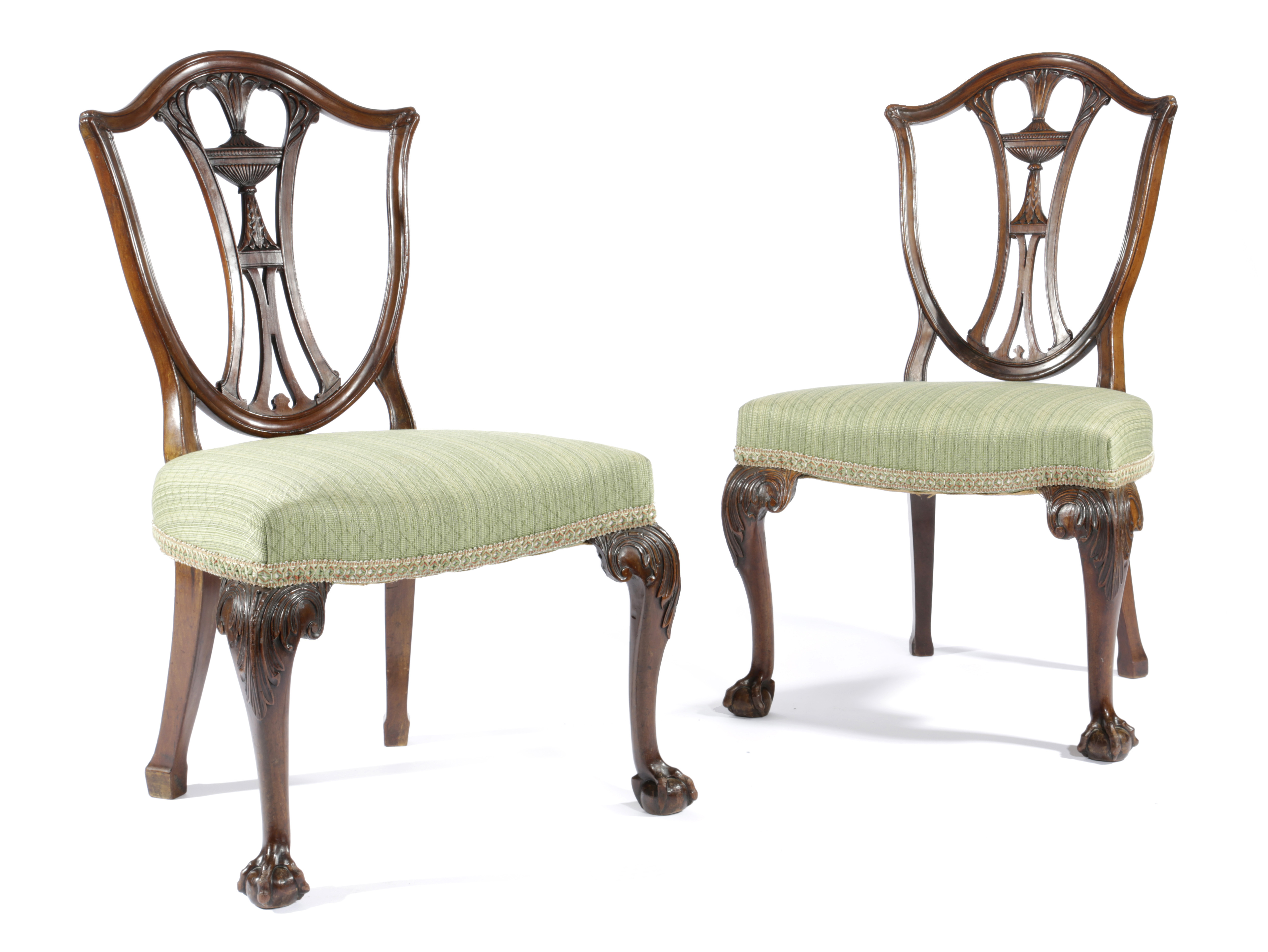 each with a shield back with an urn splat and carved with anthemion motifs, with a stuffed over seat, with leaf capped cabriole front legs and claw and ball feet (2)