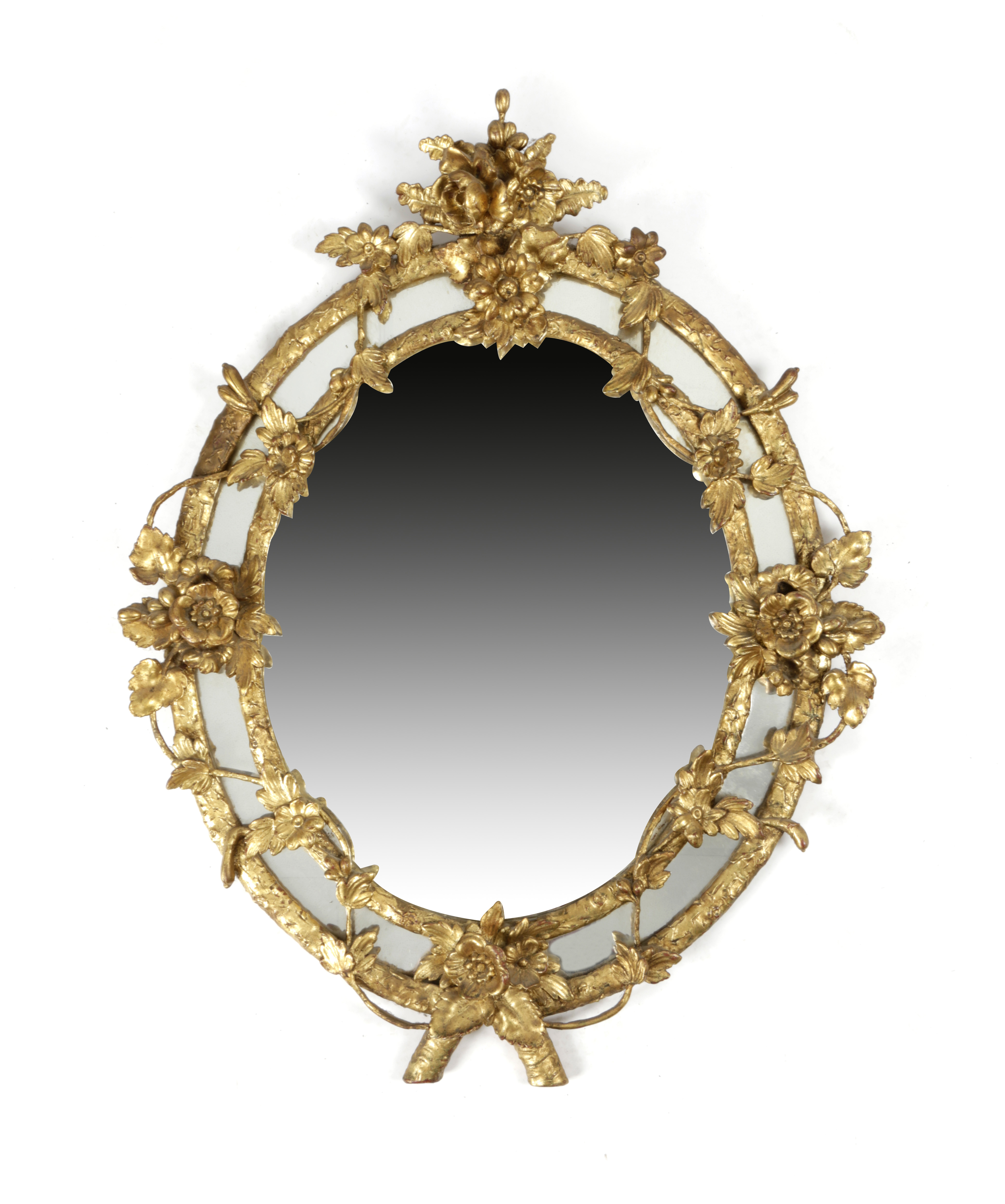 the oval plate within a Rococo frame, carved with scrolling leaves and flowers, with marginal plates