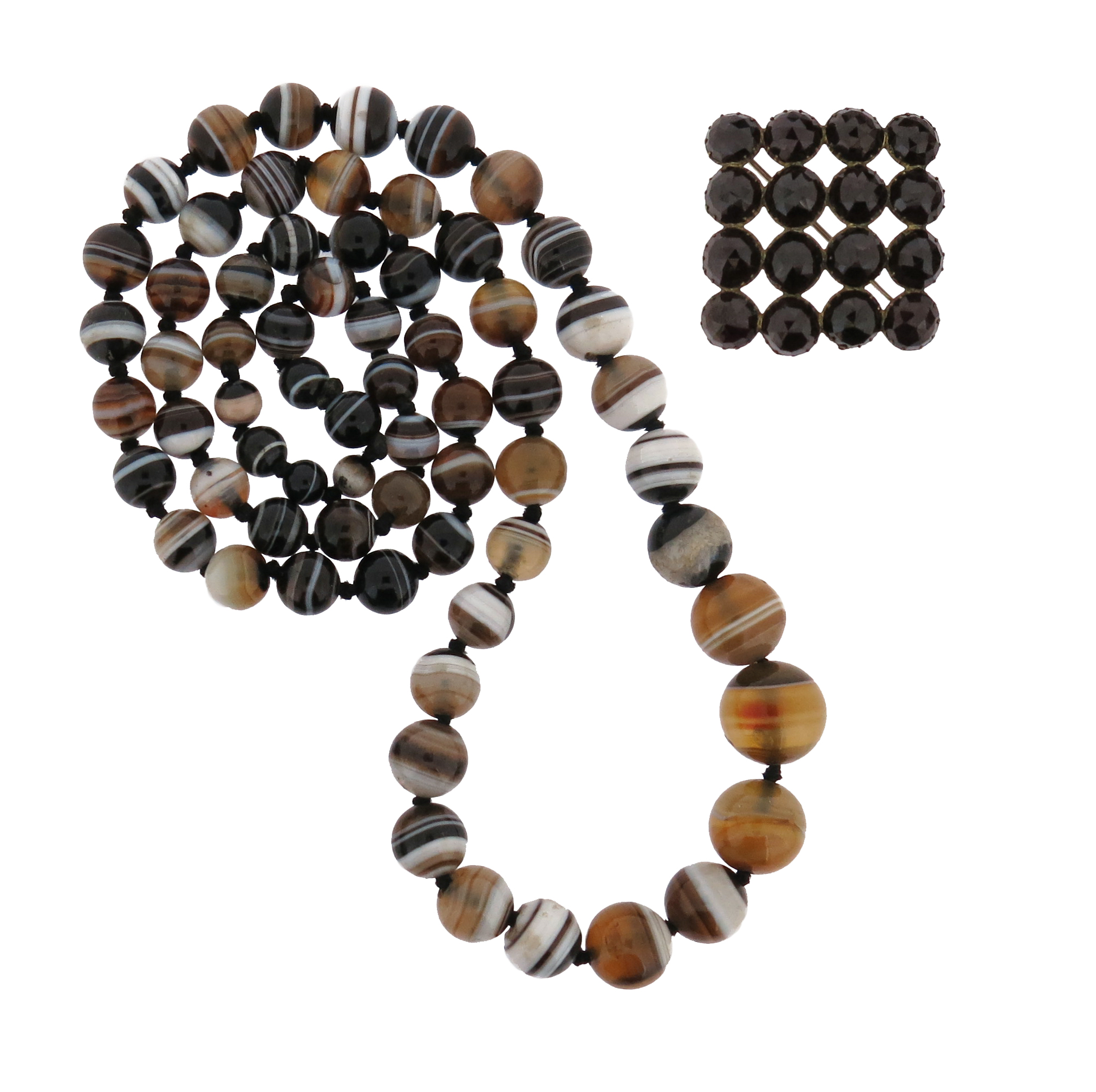 A graduated banded agate bead necklace, 76cm, and a low carat gold brooch set with sixteen round faceted garnets