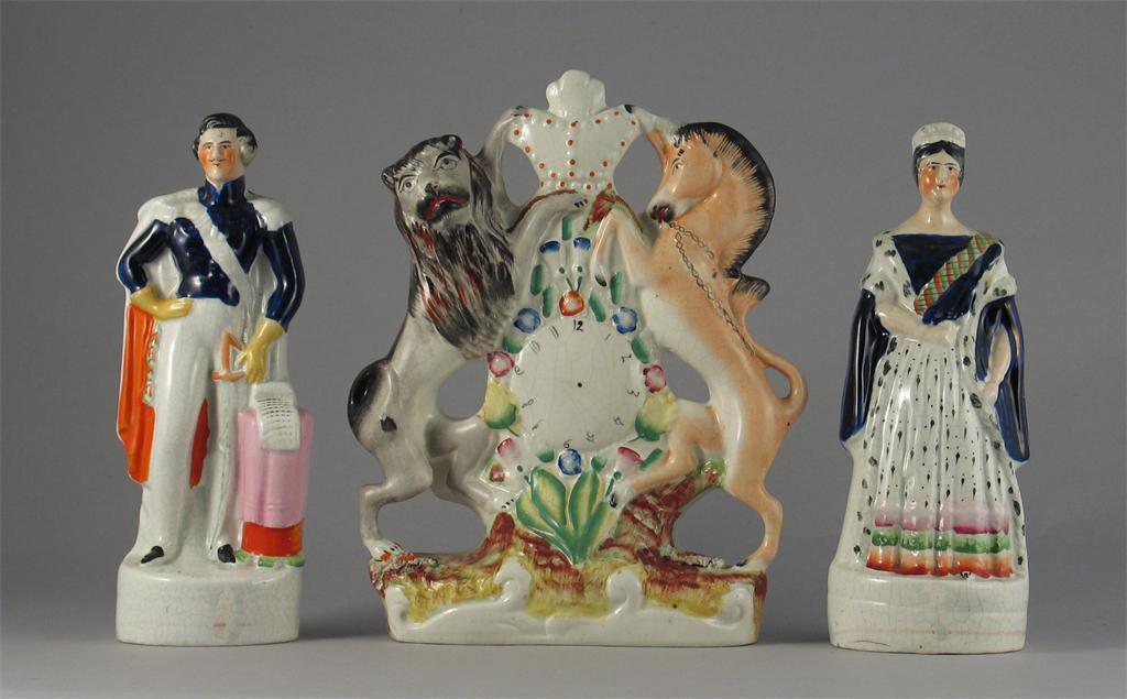 A pair of Royal portrait figures, of Victoria and Albert and a model of the Royal coat of arms, 24cm. Max. (3)