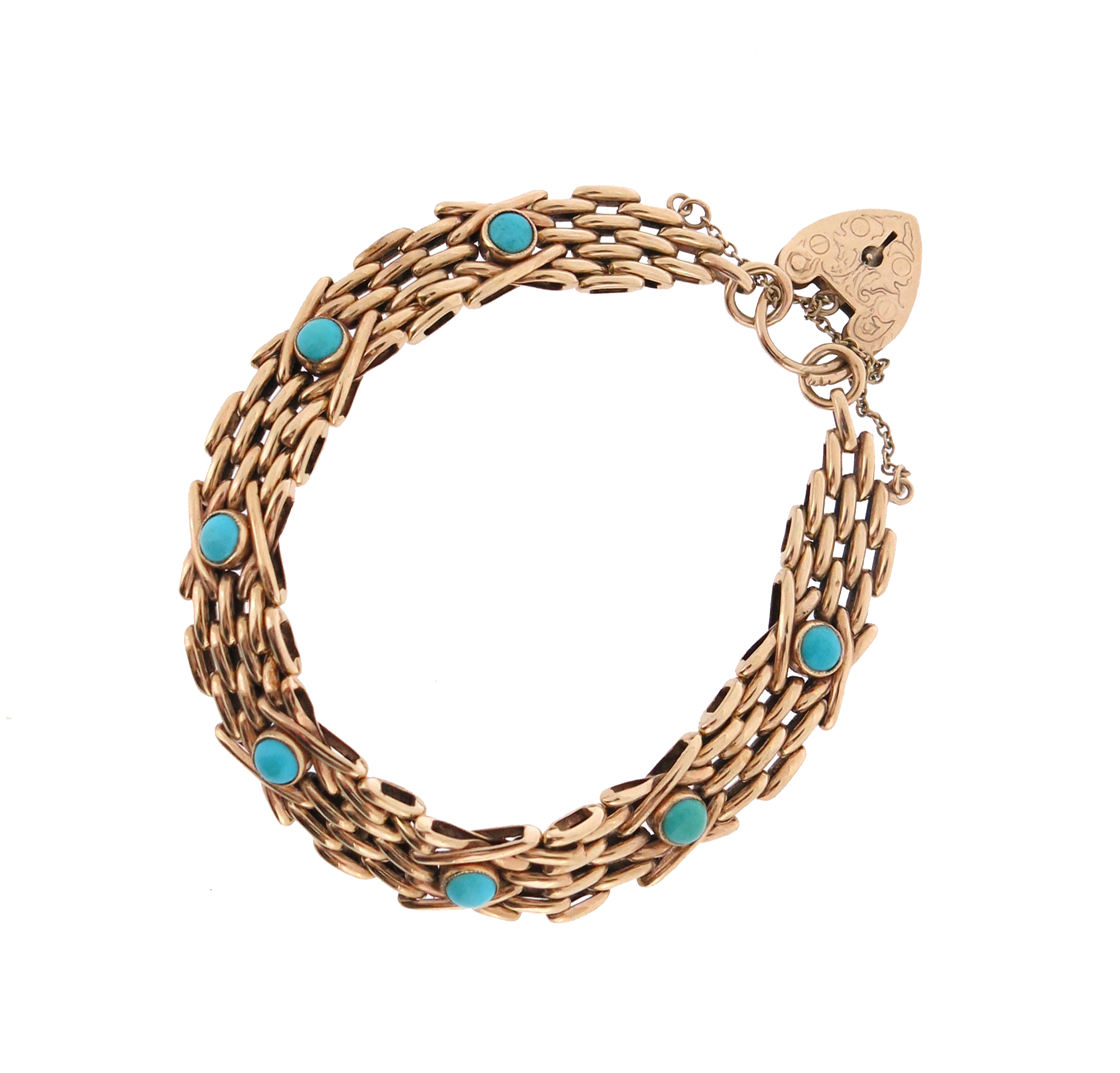 A 9ct gold gate-link bracelet, mounted with circular turquoise cabochons and with 9ct gold padlock clasp, 20cm, approximately 21g