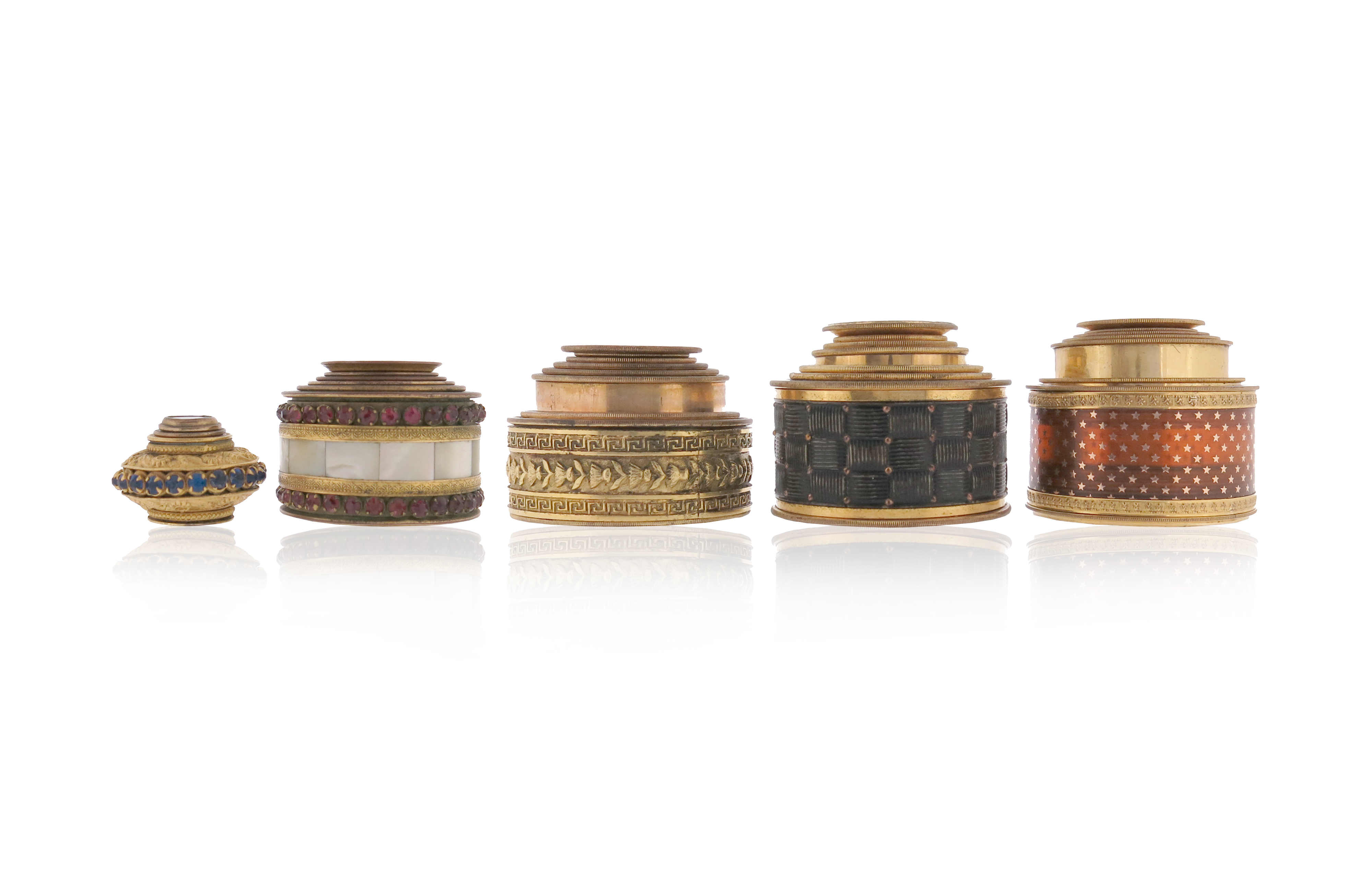 A French early 19th century gilt metal six-draw monocular, with undecipherable writing at the eyepiece and engraved Place du Pont Neuf a Paris, the tortoiseshell base with gold star decoration, 9cm long (extended), three similar monoculars and a small pendant monocular, 3cm extended and with pendant loop