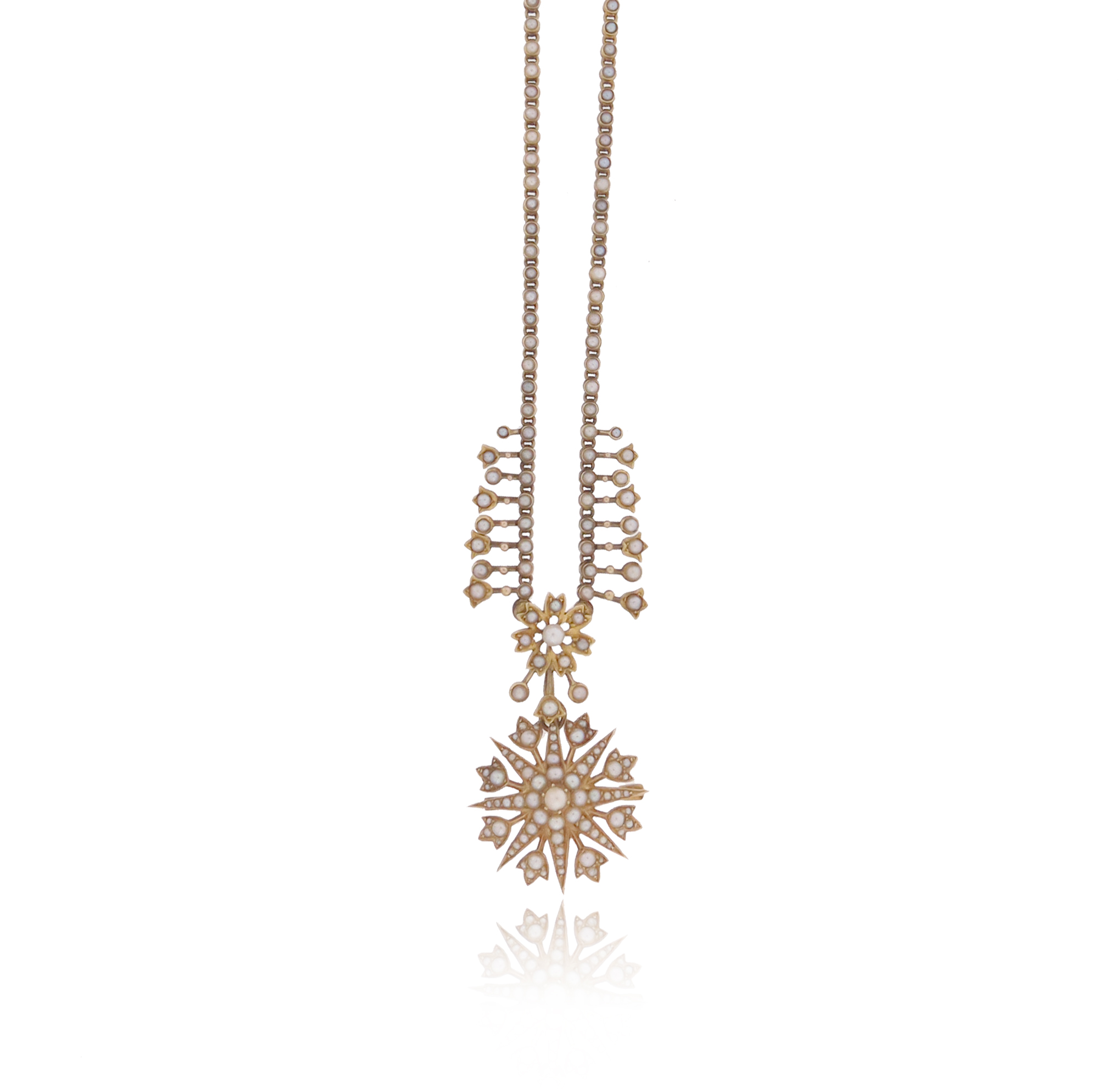 An Edwardian seed-pearl set gold fringe necklace, set overall with seed pearls, with detachable star pendant brooch, 39cm long