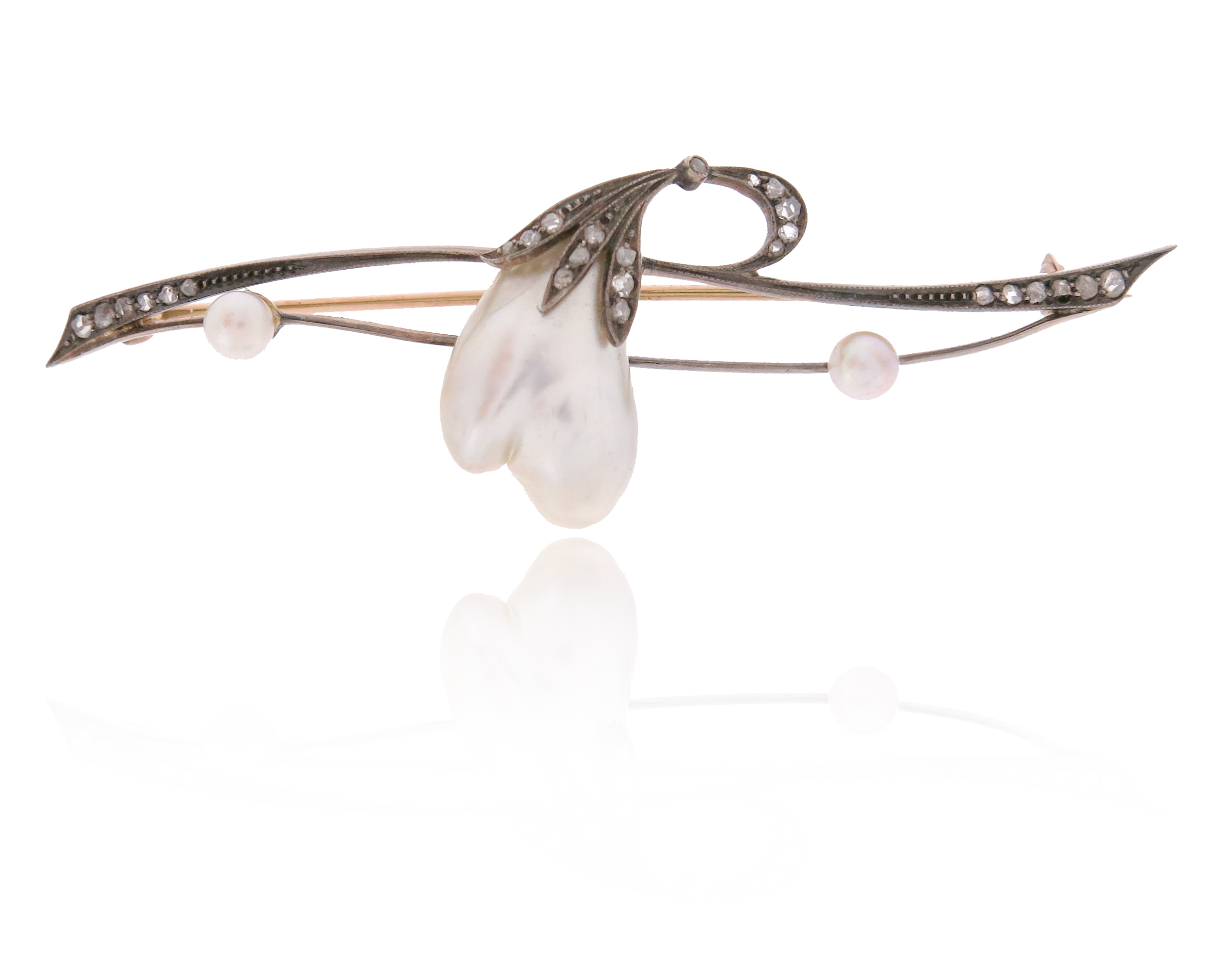 A late 19th century natural pearl and diamond floral brooch, the hollow natural pearl mounted as a stylised snowdrop (nivalis), with rose-cut diamomd-set sepals, set on a curvilinear brooch with rose-cut diamond-set terminals in silver on gold, 8.6cm wide