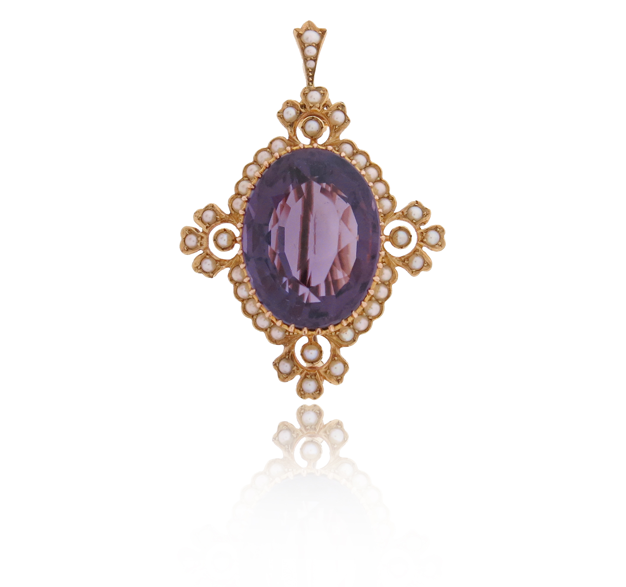 An Edwardian amethyst and seed pearl mounted gold brooch pendant