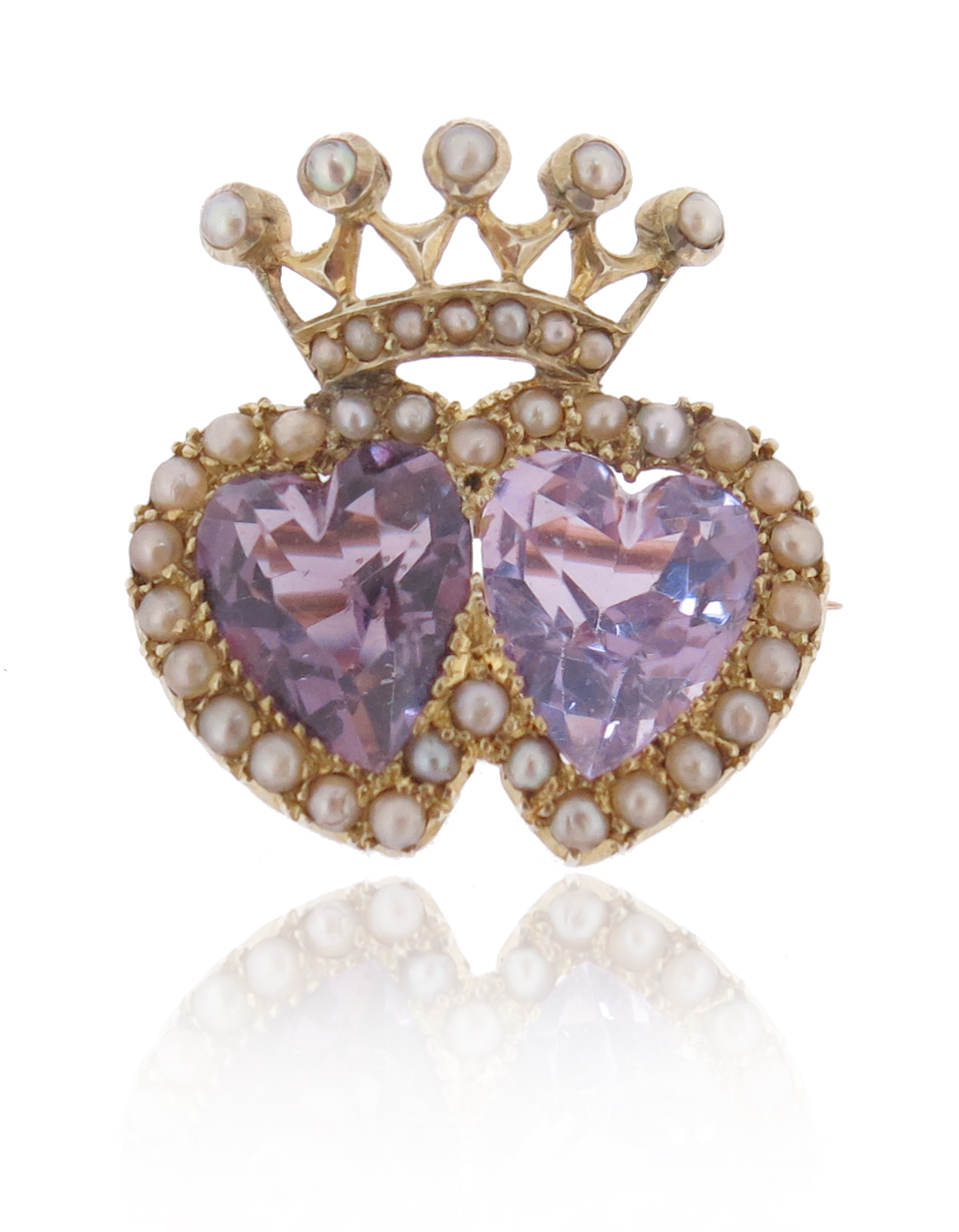 A late Victorian amethyst and seed pearl brooch, the two heart-shaped amethysts are set within a seed pearl border beneath and seed pearl coronet in yellow gold, 2.2cm wide
