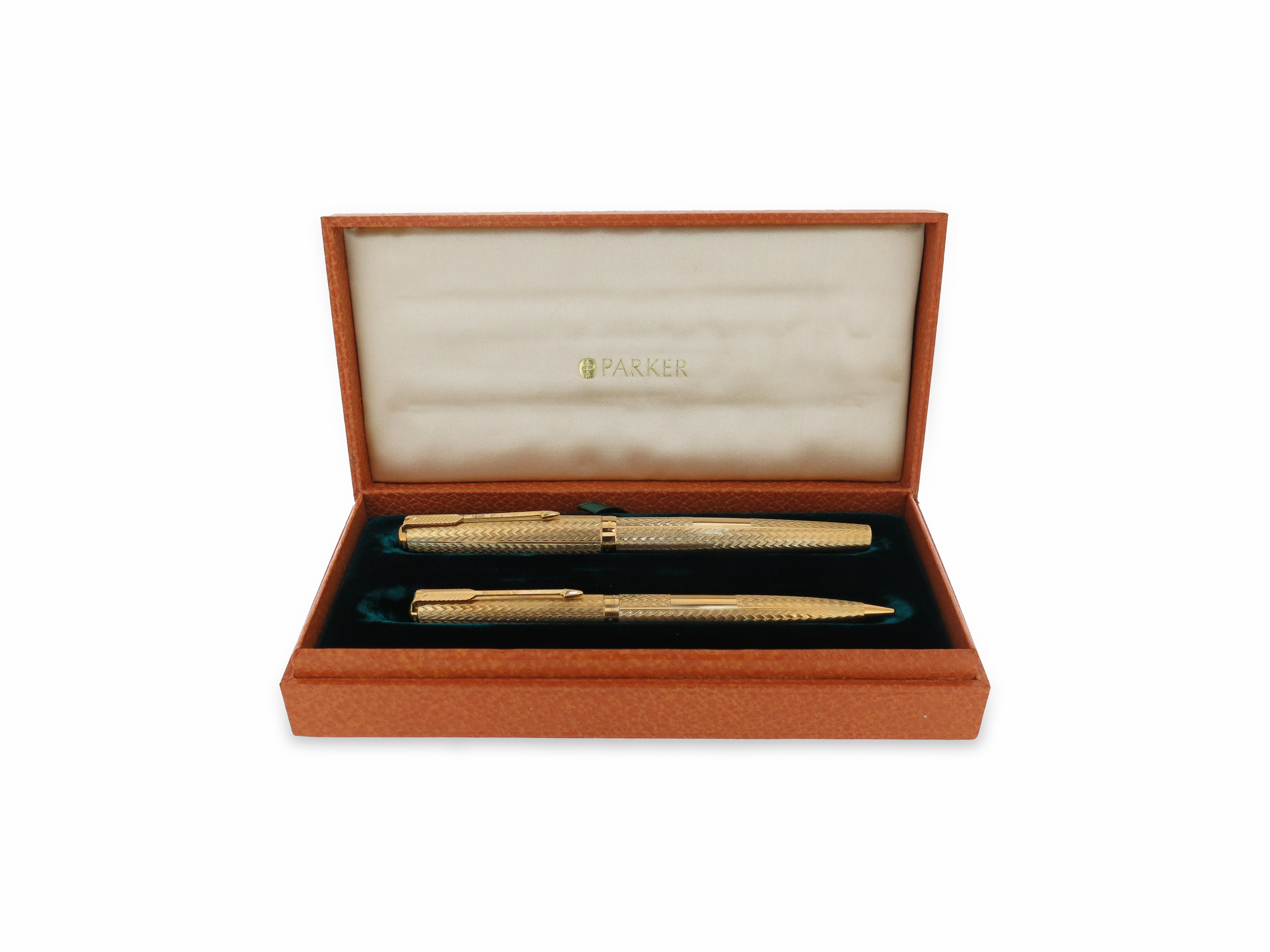 An 18ct gold Parker pen and pencil, Presidential Duette, with engine-turned decoration and London hallmarks for 1968, case