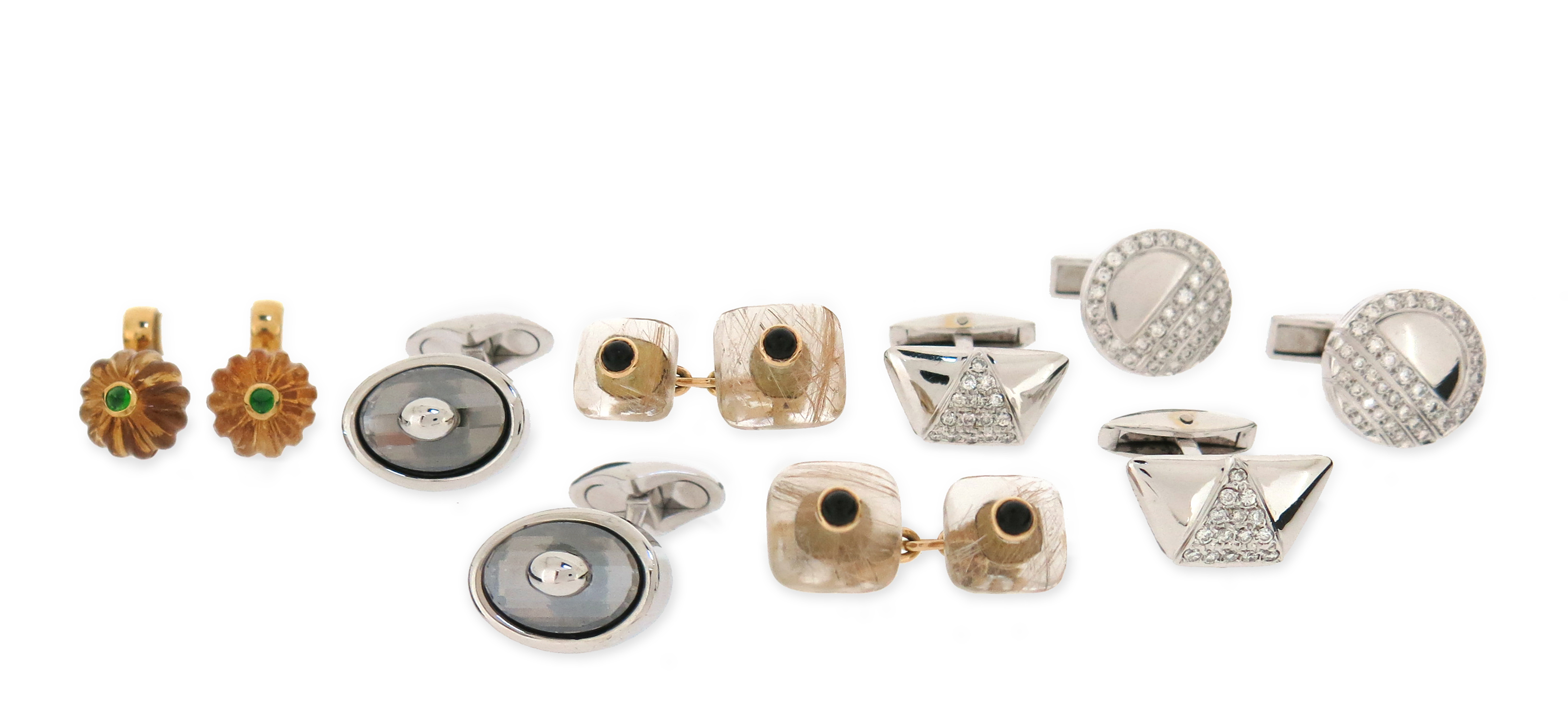 Five pairs of cufflinks, the first of white gold circular design and applied with rows of brilliant-cut diamonds, swivel backs stamped '750', 11g, the second of white gold trapezoidal design, with round brilliant-cut diamond-set detail, the swivel backs stamped '18K,750', 12g, the third of citrine pumpkin design, with a green-stone cabochon detail, rock crystal baton terminal with yellow gold chain link connections, the fourth each comprising two rutilated quartz cabochons, onyx collets, yellow gold chain link connections, together with another pair of cufflinks