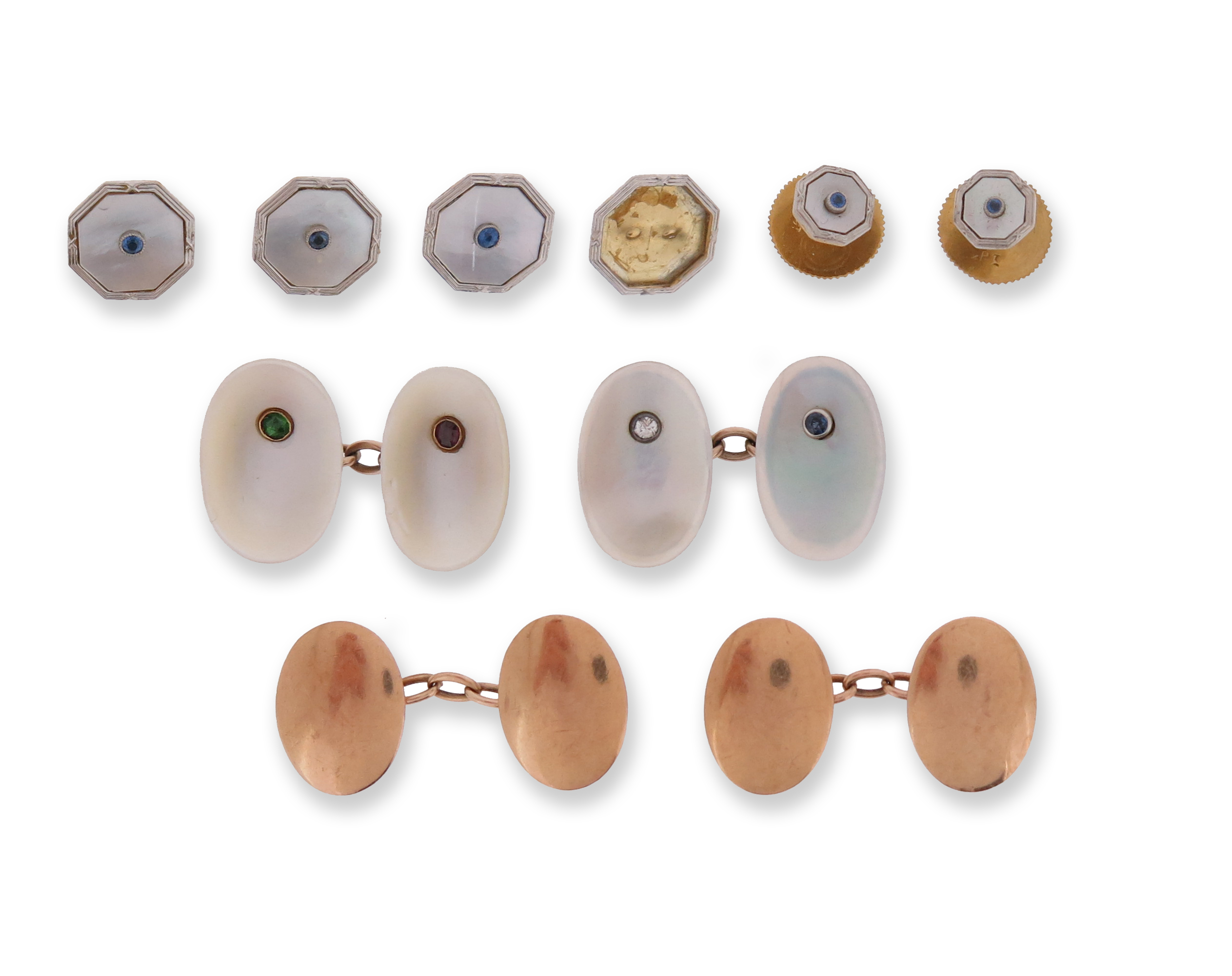 Assorted gentleman's accessories in fitted cases, including a set of four octangonal mother-of-pearl shirt buttons (one deficient), with sapphire collet centres, engraved '18CT + PLAT', and a pair of collar studs en suite, together with a pair of oval mother-of-pearl and gem-set cufflinks, each collet-set in low carat gold with either a diamond, sapphire, a ruby or a green garnet, chain link connections, and a pair of 9ct gold oval plaque cufflinks with chain link connections