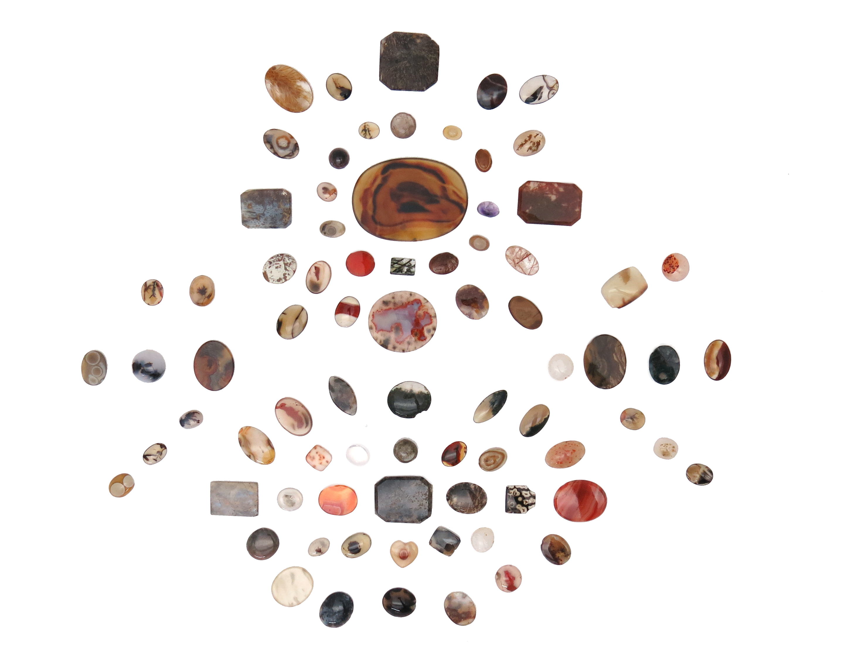 Three cased sets of dendritic and banded agate specimen stones, in three fitted hinged cases containing seventeen, thirty-one (including an additional white cabochon stone) and thirty specimen stones