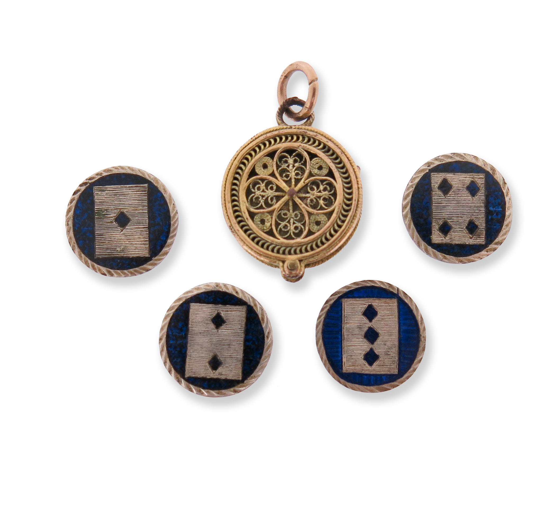 An early 19th century small circular silver gilt filigree box pendant, with sliding tray containing four silver and enamel playing card motifs, for the 2, 3, 4 and Ace of diamonds, the container 1.7cm