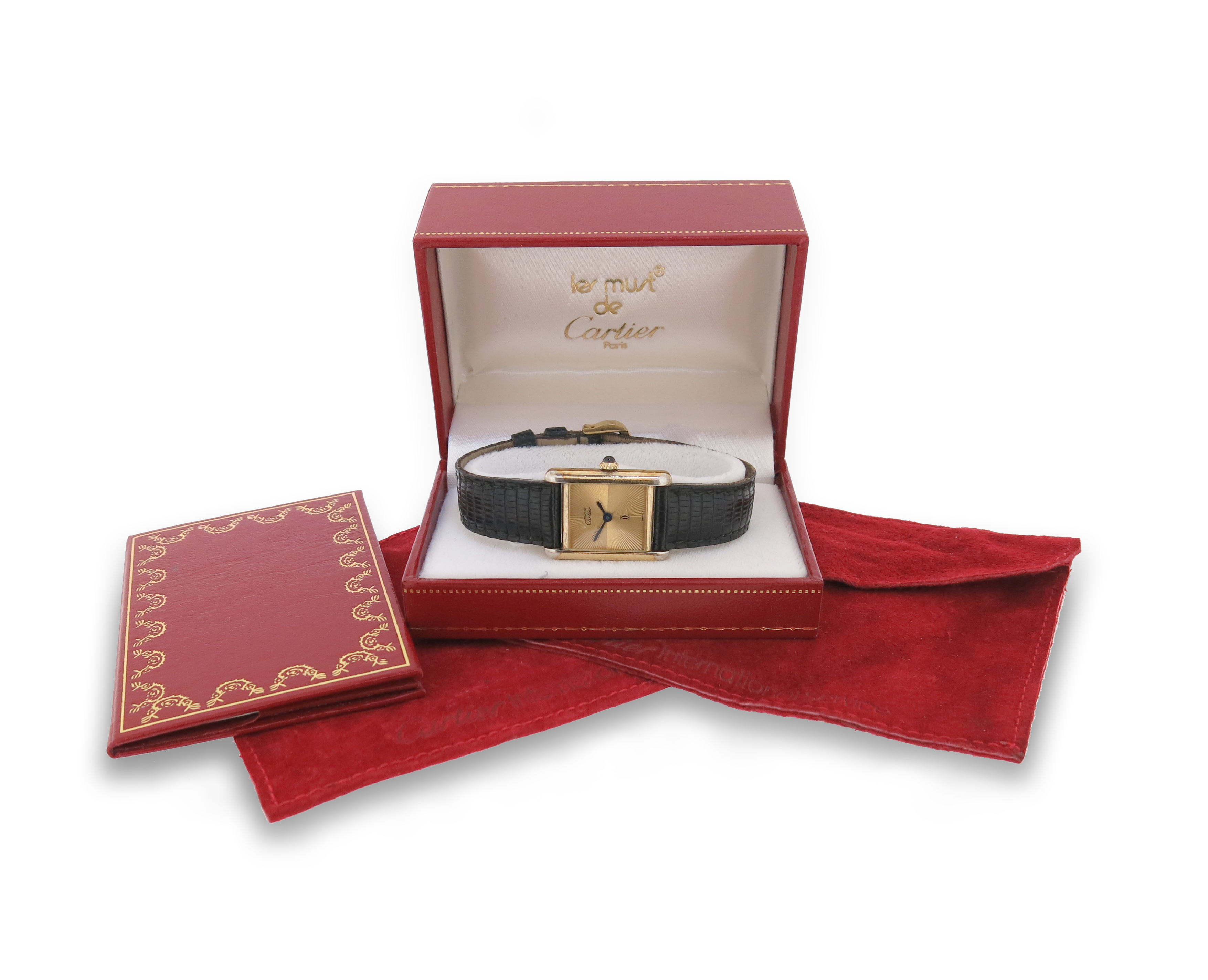 A lady's silver gilt Tank wristwatch by Cartier, the rectangular dial signed 'Must de Cartier', with addorsed 'C' logo, the reverse signed and numbered '156160', to the maker's leather strap and clasp, fitted Cartier case and outer box, two suede pouches, with papers dated 1981