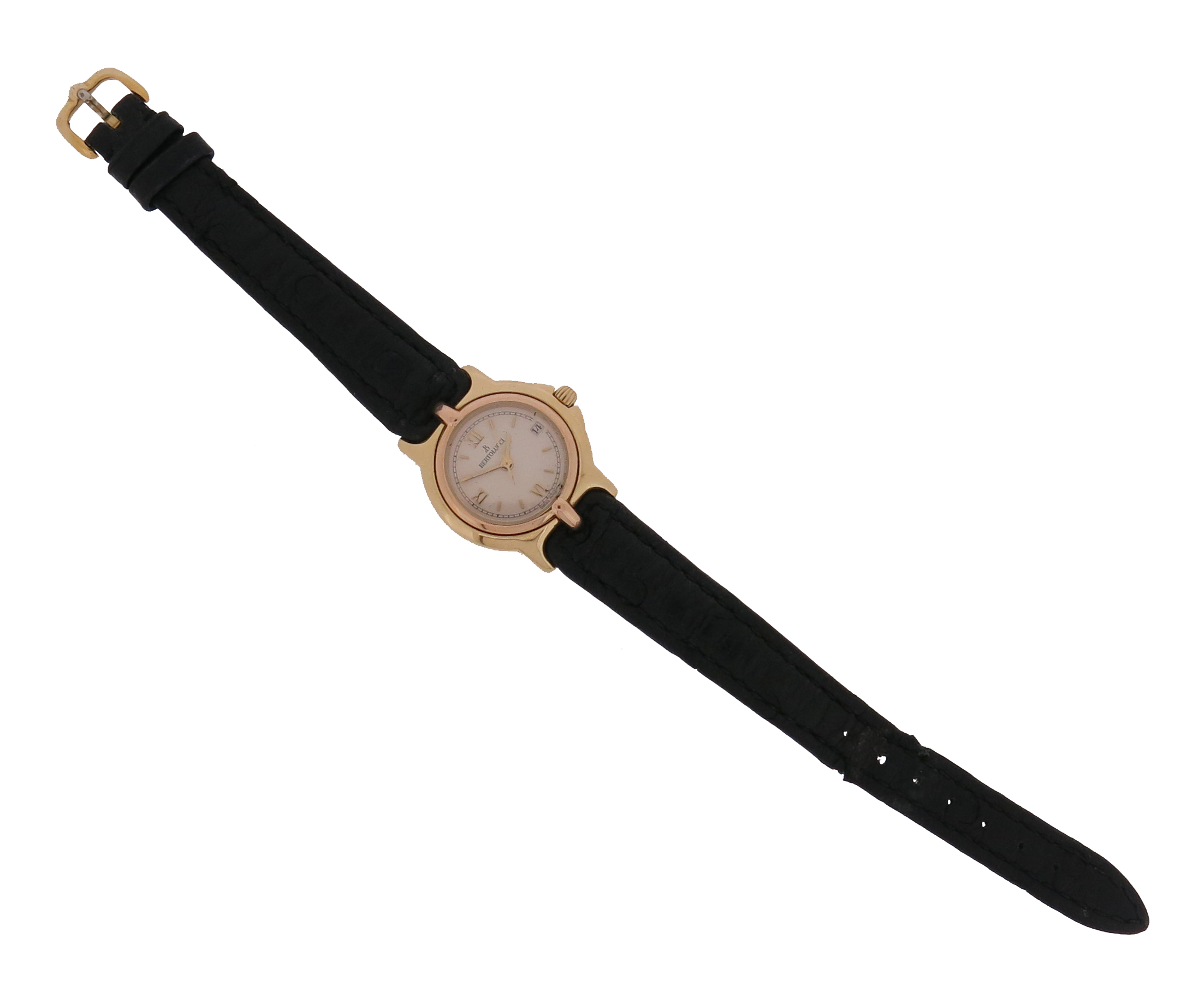 A ladies yellow gold wrist watch by Bertolucci, signed dial, sweep seconds hand, the reverse stamped Pulchra, 18k, 2.6cm wide, black leather band with Bertolucci clasp