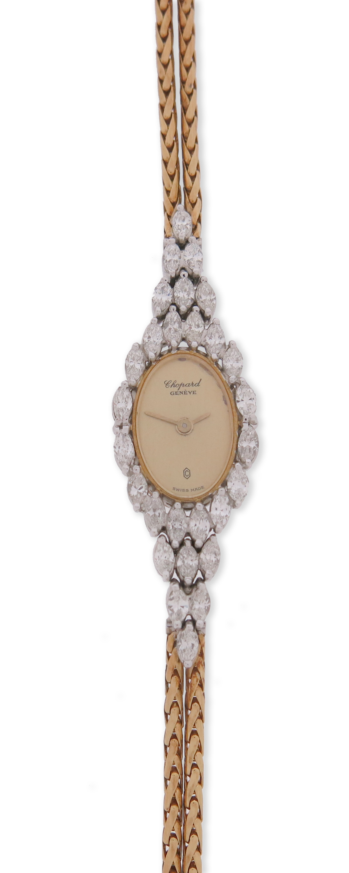 A lady's diamond wristwatch by Chopard, the signed gold dial set within a surround of marquise-shaped diamonds on flexible gold bracelet, quartz movement, 15mm wide, 17cm long